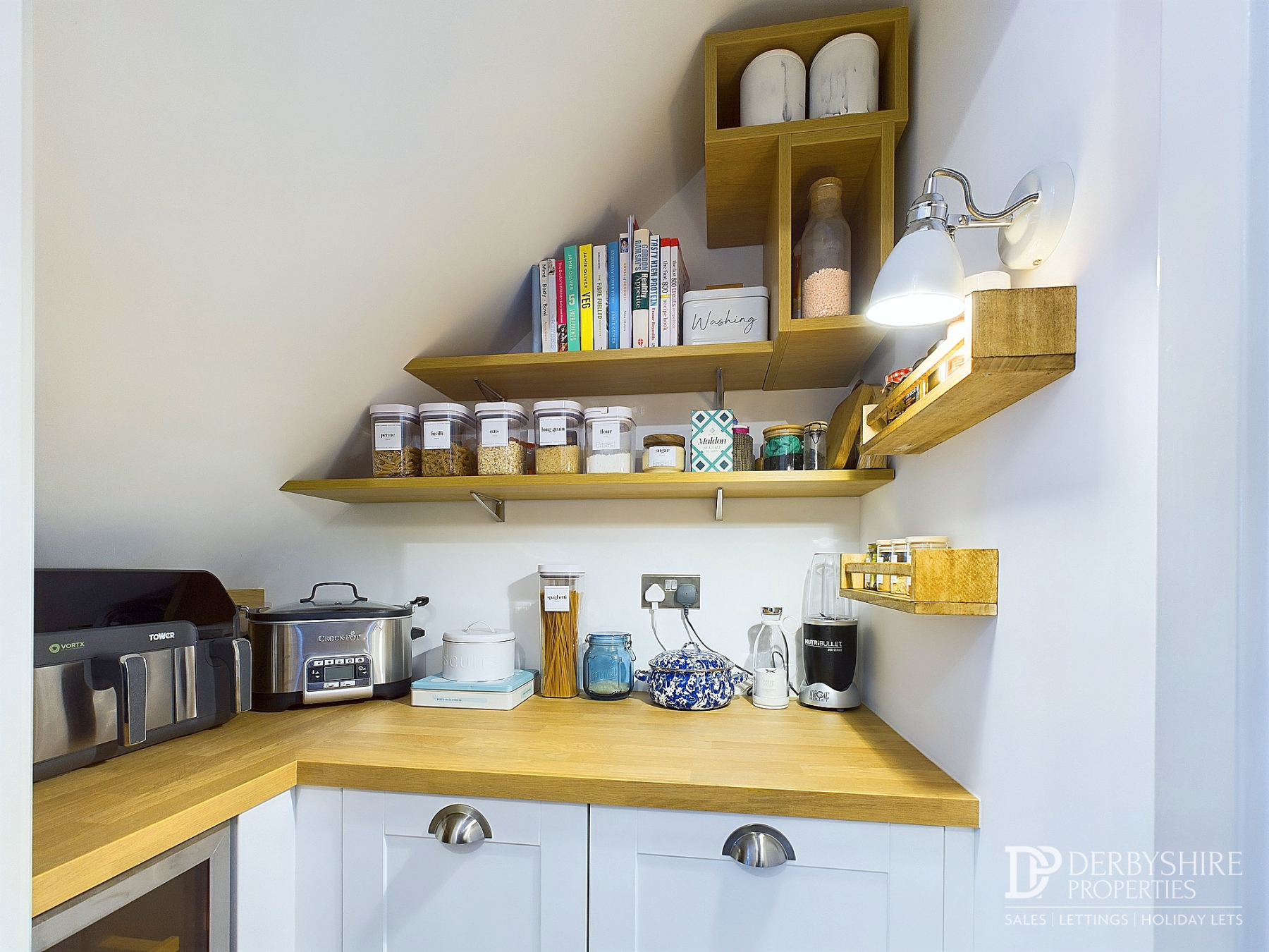 This bespoke Wren pantry with shaker style soft close cupboards, and includes integrated wine cooler, shelving, spot lighting to ceiling and LVT flooring.