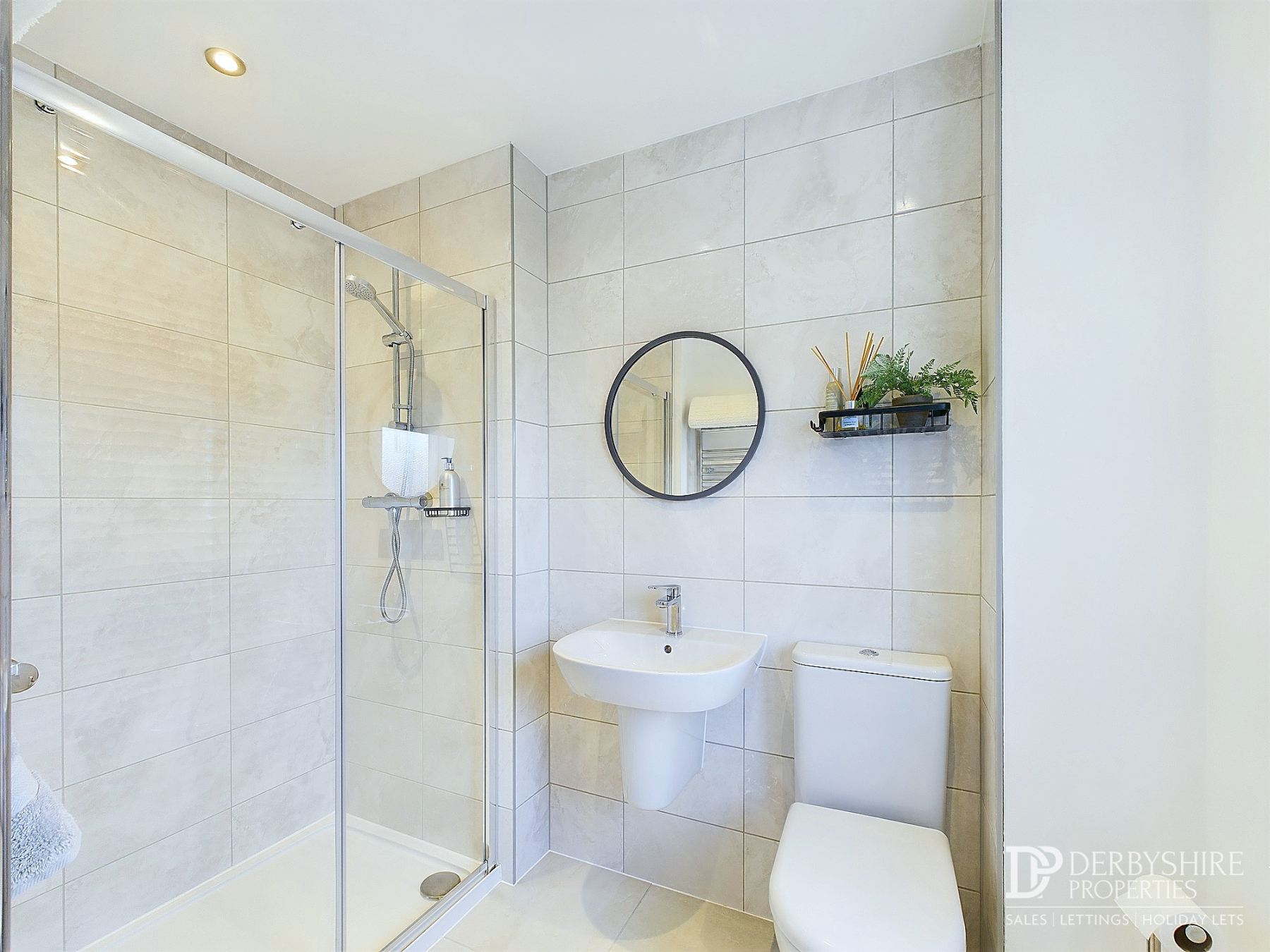 Having modern white sanitary ware comprising; low-level WC, 'floating' wash hand basin, and panelled with mains shower mixer taps and glazed shower screen, heated chrome towel rail, tiled floor and walls, spot lighting and extractor fan to ceiling.