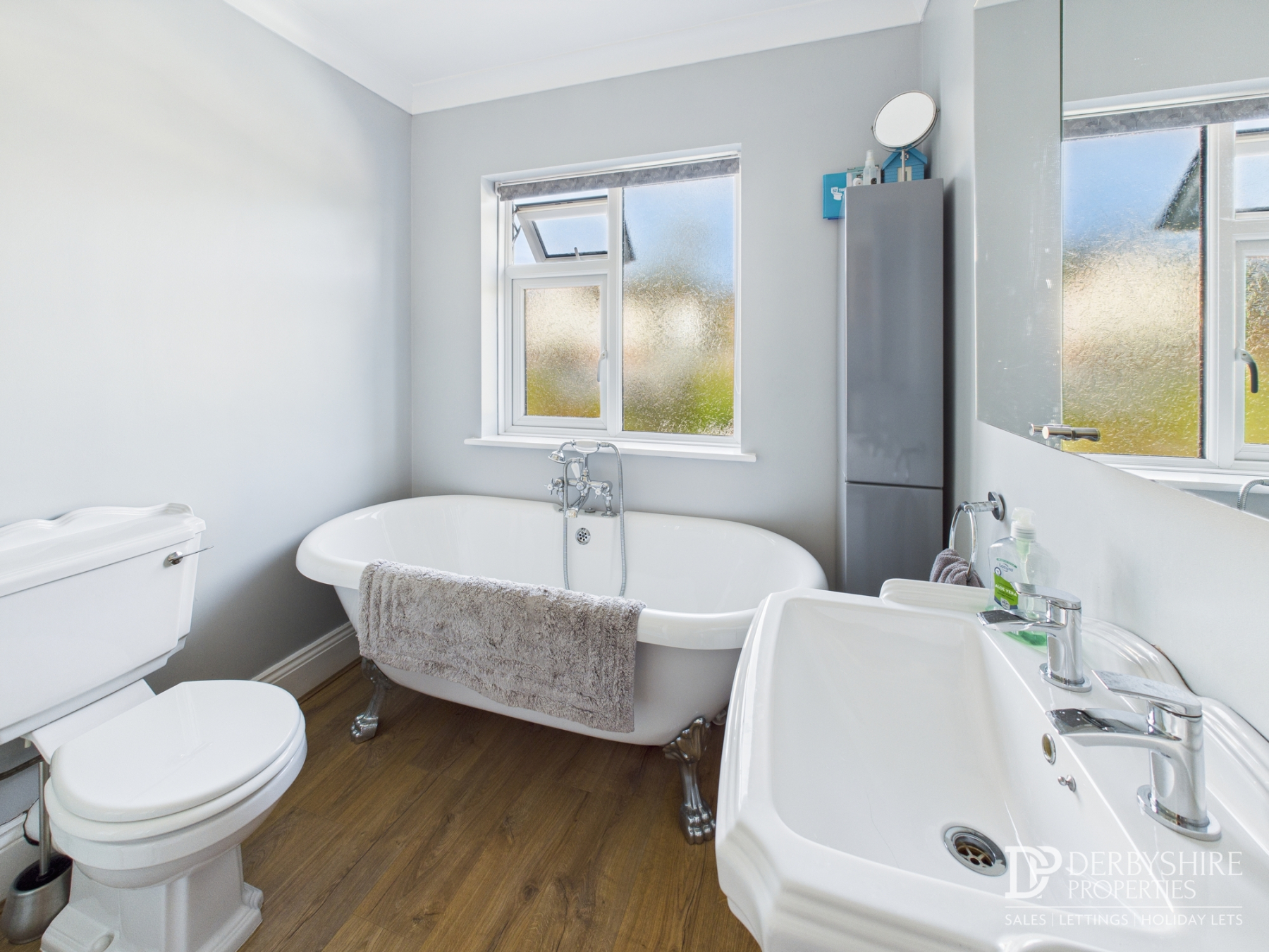 Comprising of a four piece suite, to include WC, pedestal wash hand basin, shower enclosure with wall mounted electric shower and attachment over and a superb, freestanding roll-top bath with centrally mounted taps. Wood floor covering, wall mounted chrome heated towel rail, decorative coving to ceiling, double glazed obscure window and ceiling mounted extractor fan.
