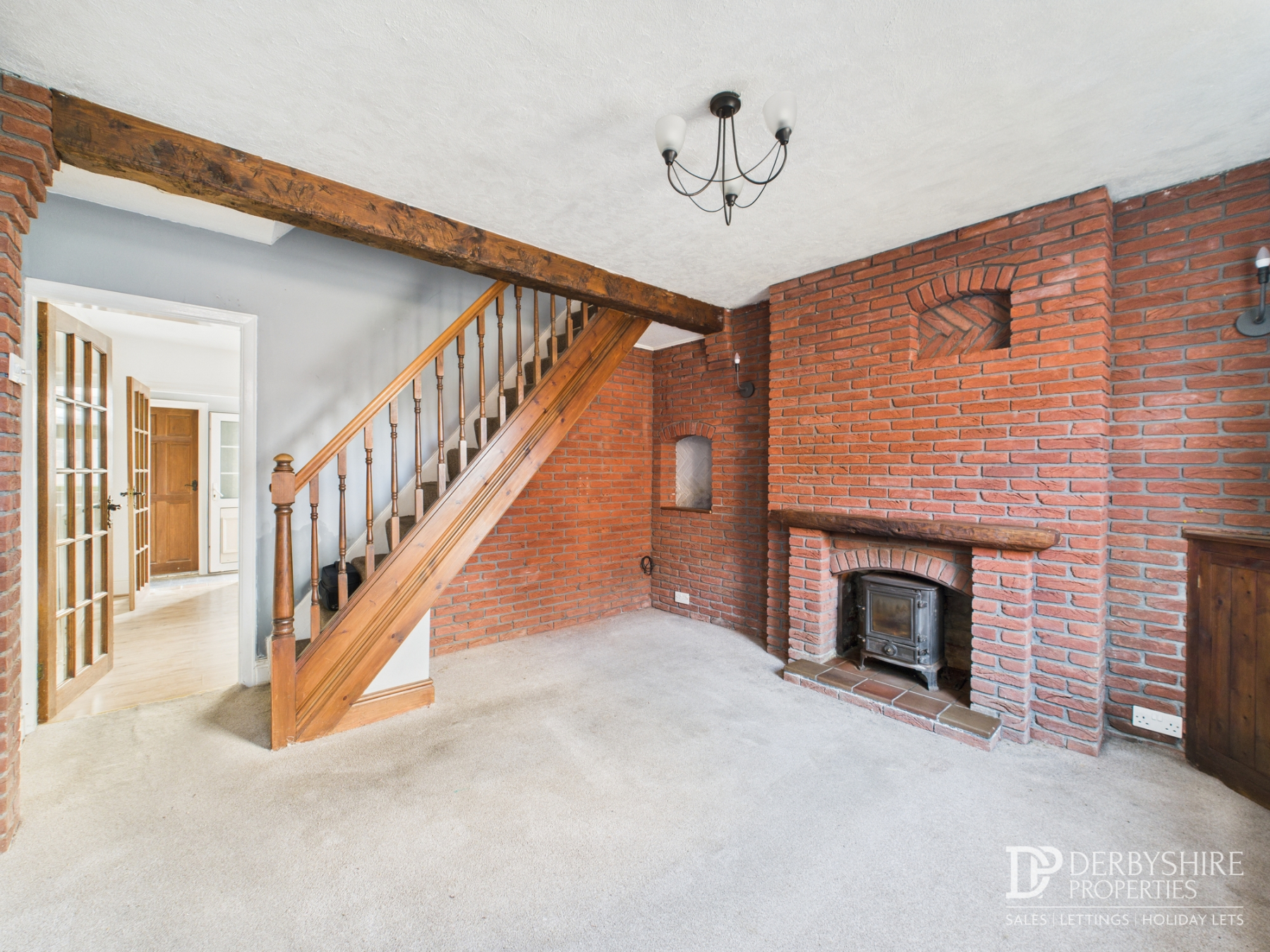 12' 7" x 11' 9" (3.84m x 3.58m) UPVc part-glazed door, double glazed window, log burner with brick fireplace, ornamental niches, radiator, mock beam ceiling, wall lights, open staircase.