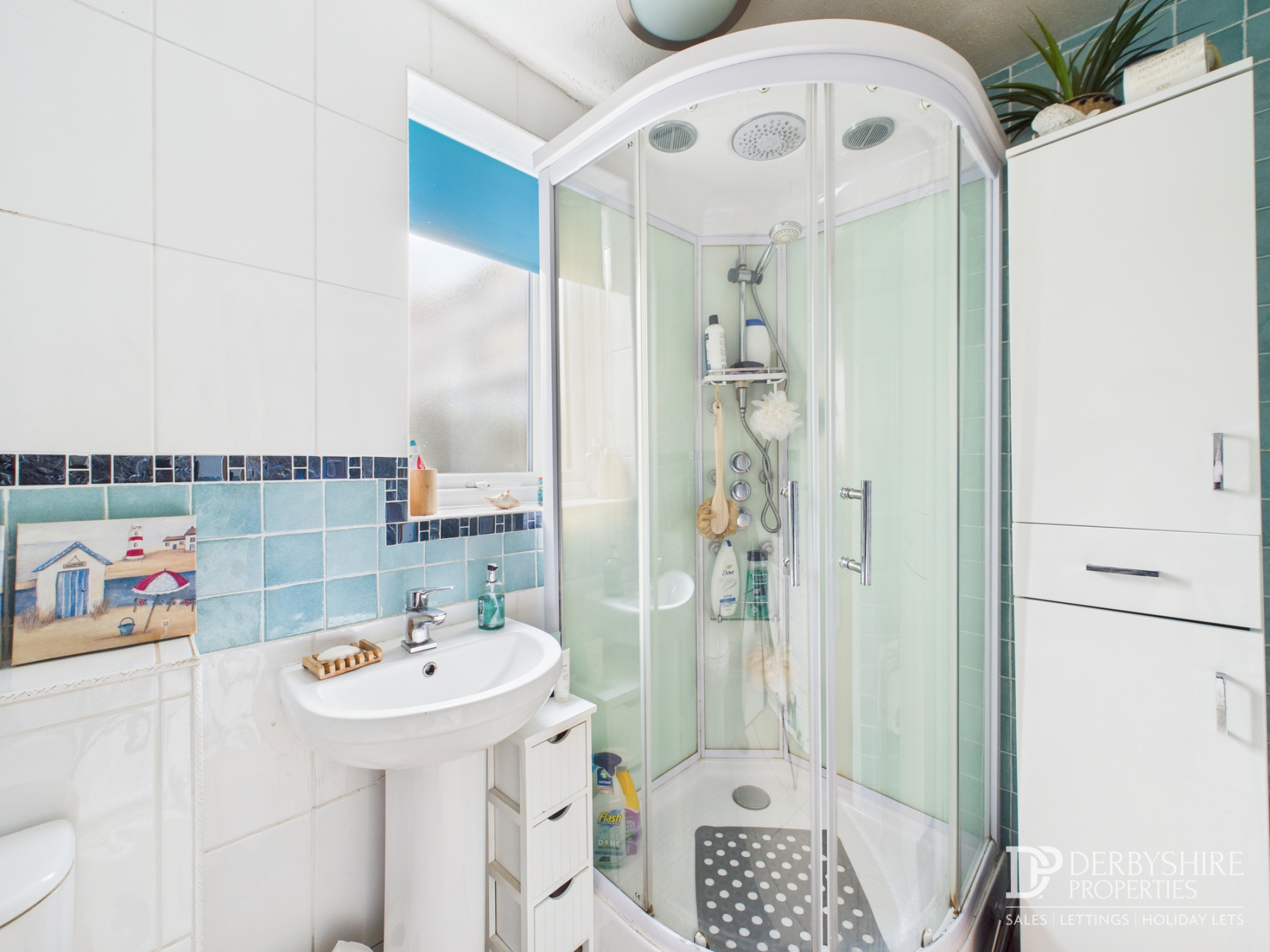7' 3" x 4' 11" (2.21m x 1.50m) A tiled three piece suite including; Corner shower cubicle, pedestal handwash basin and low level WC. Wall mounted radiator, double glazed obscured window to rear elevation and ceiling fitted extractor unit complete the space.