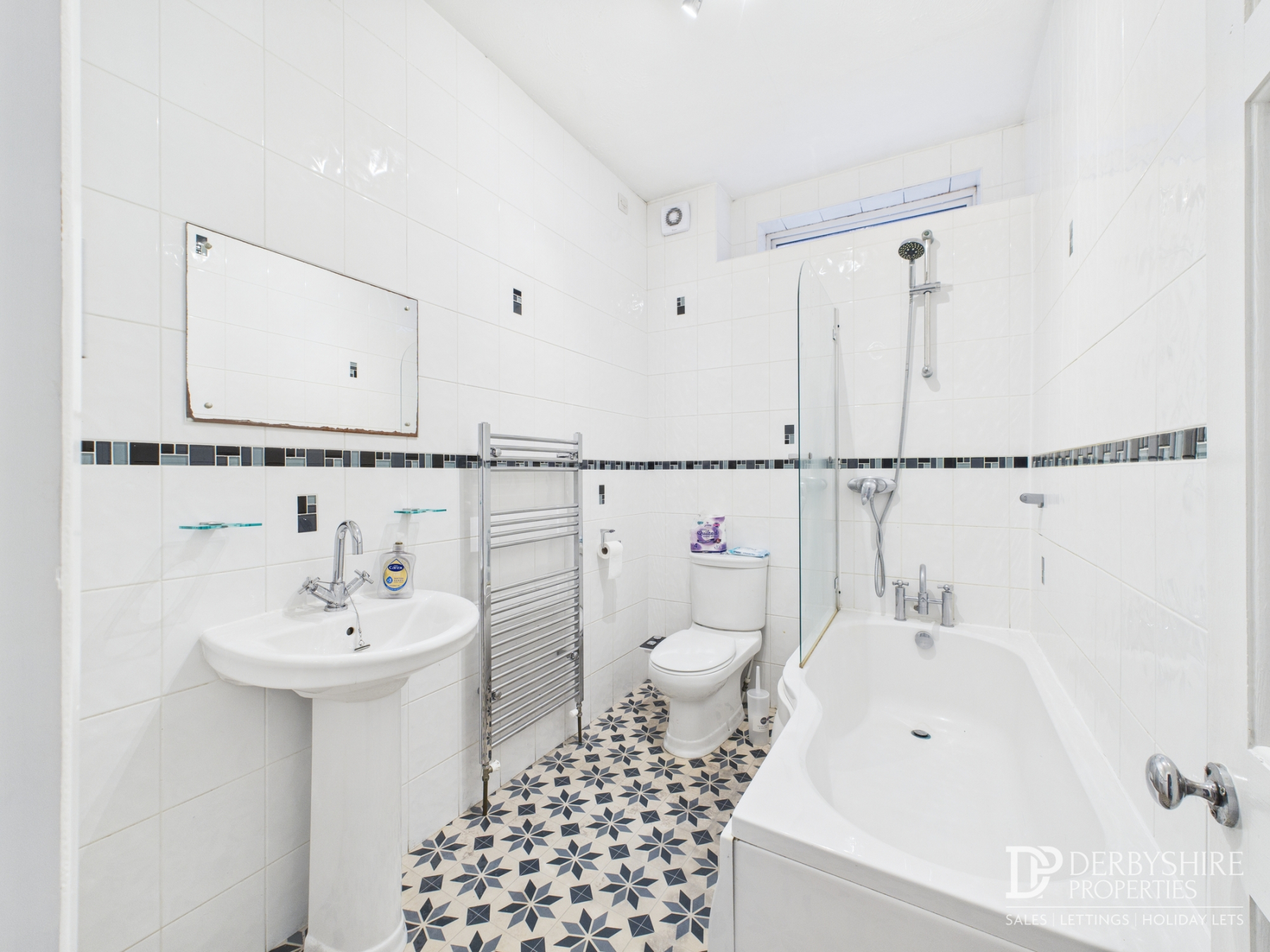A tiled three piece suite including; Bath with shower screen and attachment, pedestal handwash basin and low level WC. Wall mounted heated towel rail and wall fitted extractor unit completes the space.