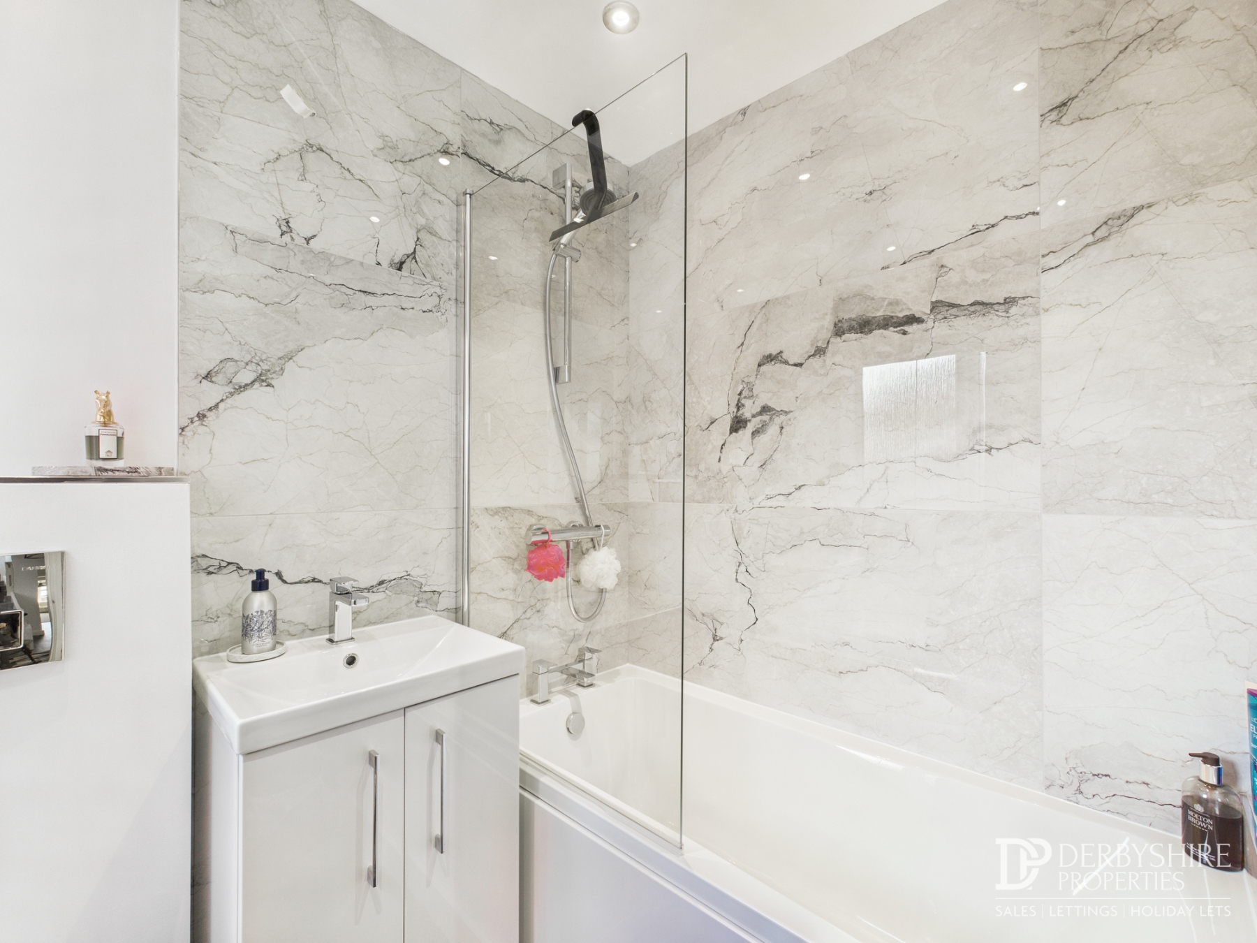 A beautifully appointed modern three-piece suite comprising a close-coupled WC, vanity wash basin and bath with mains-fed shower above and complementary glass screen. Finished with marble-effect wall tiling, wood-effect flooring, chrome heated towel rail, double glazed obscured window to the side elevation, extractor fan and ceiling spotlighting.