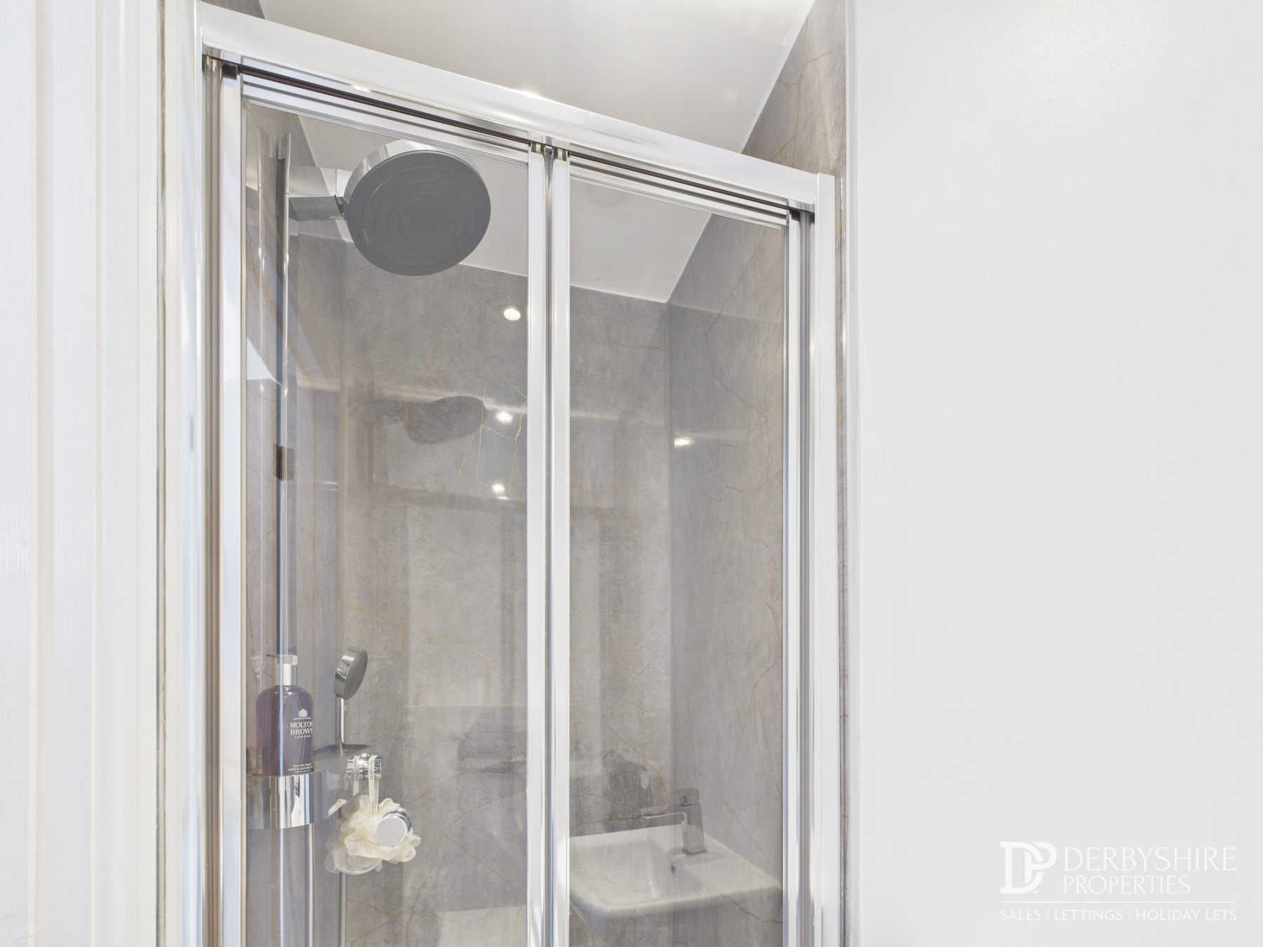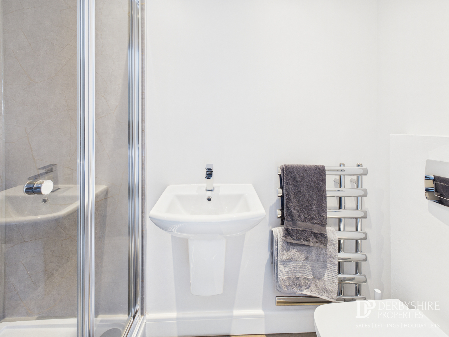 Beautifully appointed three-piece suite comprising an enclosed WC, pedestal washbasin and a large shower enclosure with mains-fed shower and attachment over. Additional features include an extractor fan, ceiling spot lighting, wall-mounted chrome heated towel rail and vinyl floor covering.