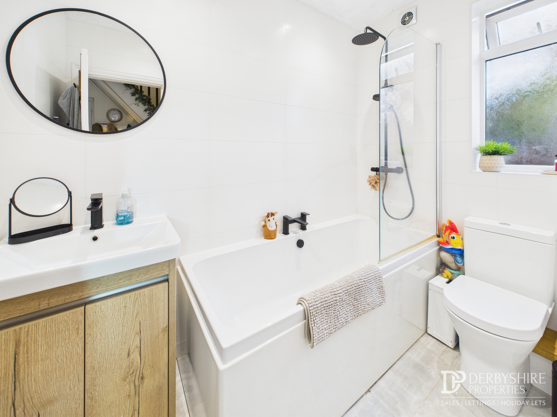 Comprising a modern three-piece white suite including WC, vanity wash hand basin and panelled bath with mains-fed shower and glass shower screen. Fully tiled walls and floor, heated towel rail, extractor fan, recessed spotlights and double-glazed obscured window.