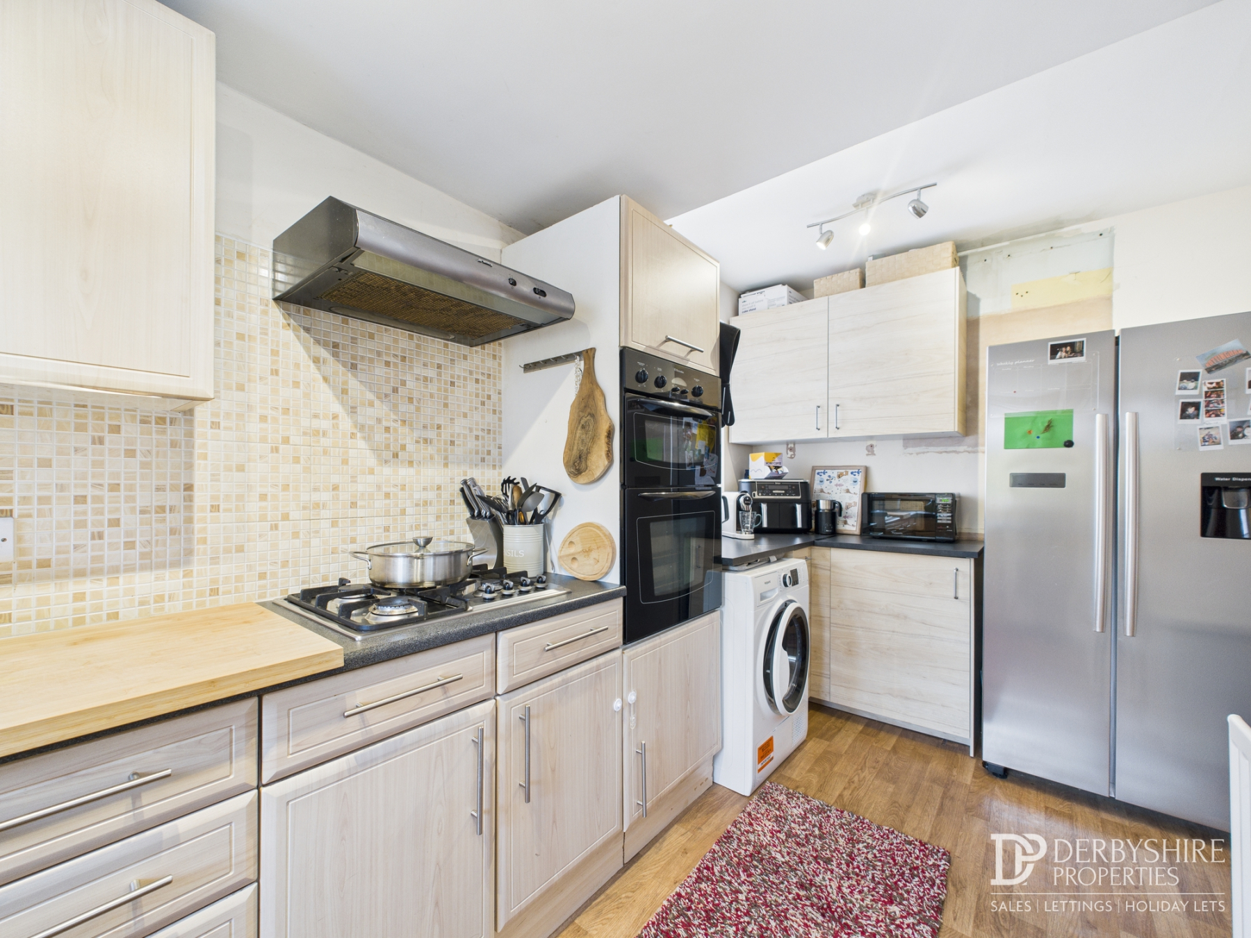 Fitted with a range of wall and base units with roll-top work surfaces incorporating a stainless steel sink and drainer with mixer tap and tiled splashbacks. Integrated gas hob with extractor hood over, integrated double oven, space and plumbing for washing machine, space for an American-style fridge freezer, wood floor covering and radiator.