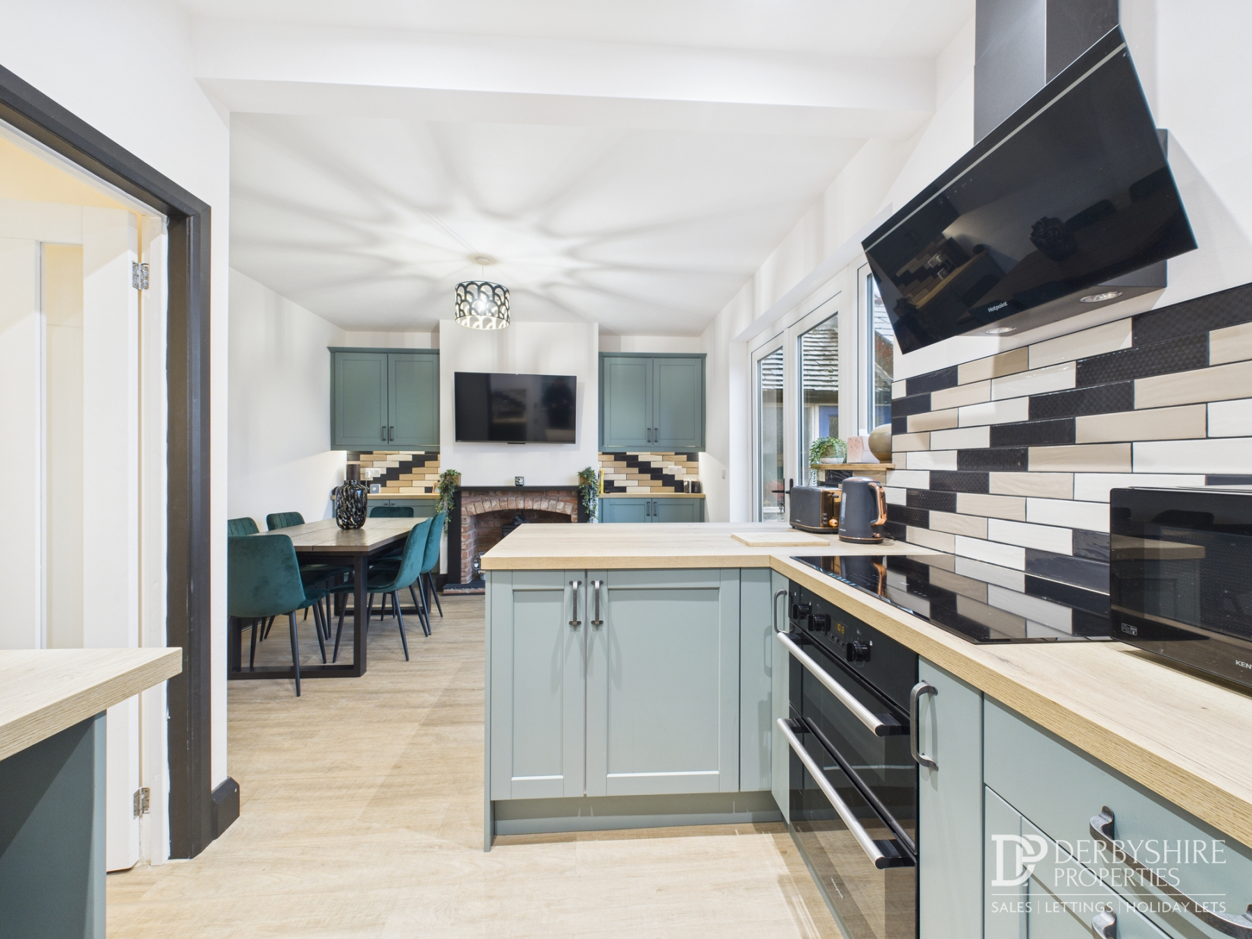 5.90m x 3.69m (19' 4" x 12' 1") A fantastic family room. The Kitchen itself features a range of base cupboards and eye level units with complimentary wood effect worktops over and integrated appliances including; AEG induction hob with accompanying extractor hood, double oven and inset sink. Composite stable door access side elevation. Tiled splashback covers the workspace whilst wood effect flooring extends to the Dining Area. Wall mounted radiator, dual fitted units and double glazed French doors accessing rear enclosed garden all feature whilst exposed brick fireplace and raised hearth add a traditional aspect to this modern area.