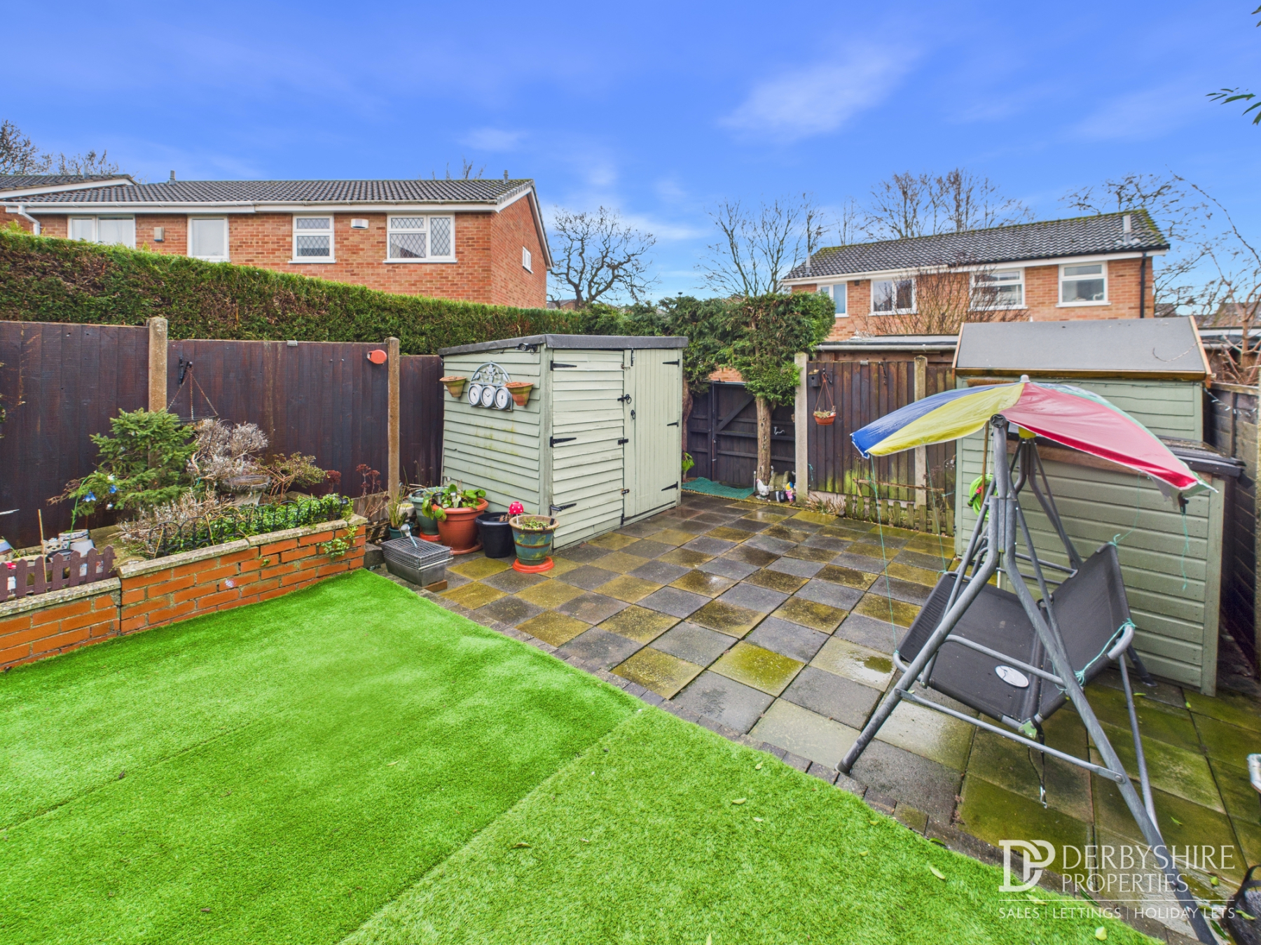 The property occupies a generous corner plot and benefits from a low-maintenance tarmac frontage providing parking, alongside a driveway offering additional parking space. The side garden is mainly laid to lawn, enclosed by timber fencing, and includes a handy garden shed. The rear garden features a low-maintenance Astroturf lawn with raised flower beds, an outside tap, and lighting, all fully enclosed by timber fencing, creating a private and easy-to-maintain outdoor space