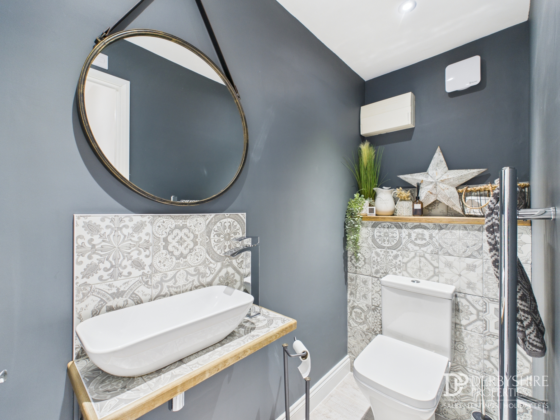Formerly part of the garage and now converted to provide a stylish cloakroom with low-level WC, wall-mounted wash hand basin with tiled splashback and cascading chrome tap. Finished with wood flooring, ceiling spotlights, and extractor fan.