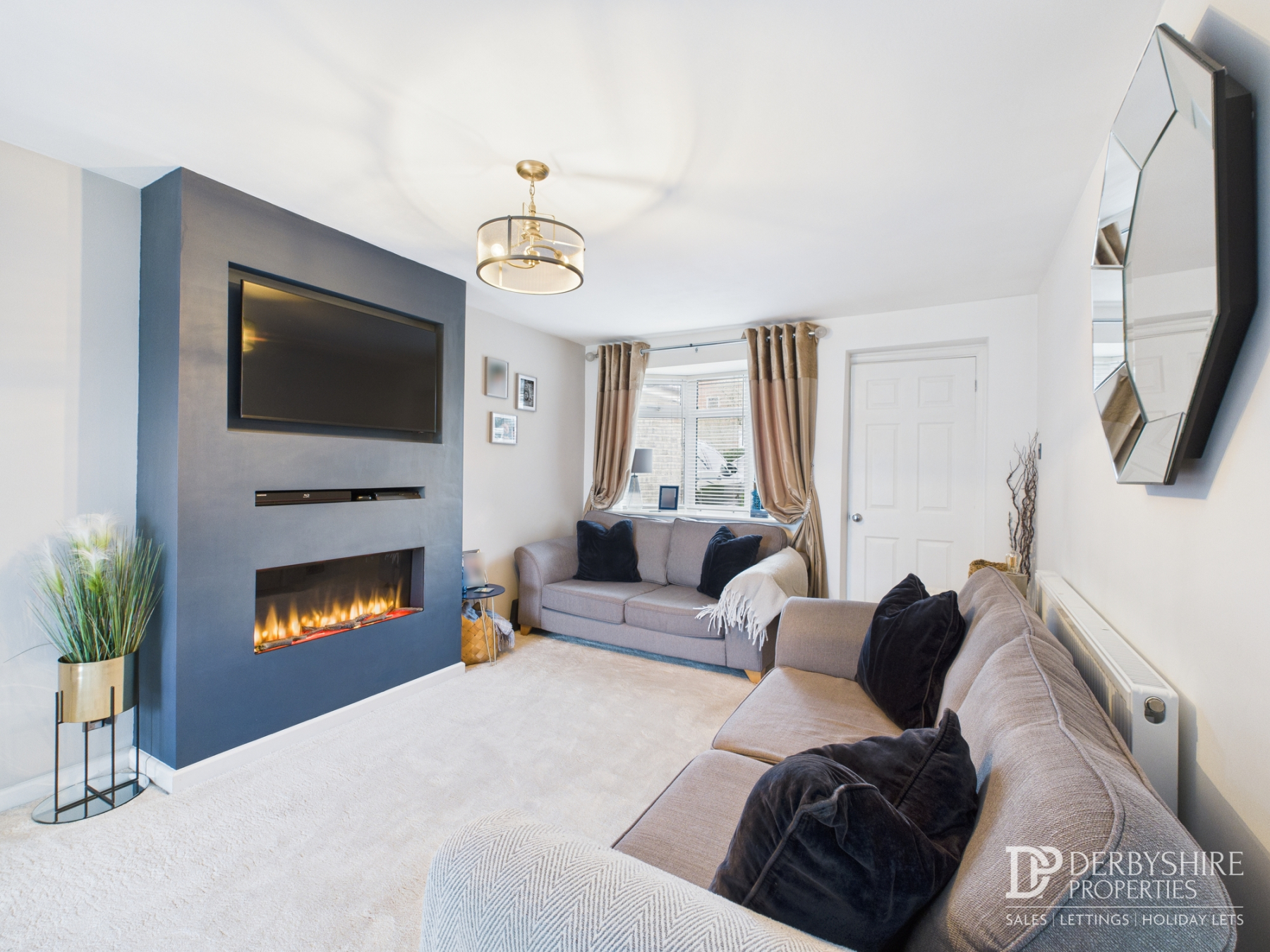 A light and welcoming reception room with a double-glazed window to the front elevation and wall-mounted radiator. The focal point of the room is a bespoke media wall incorporating an inset gas fire and feature alcoves for television and media equipment.