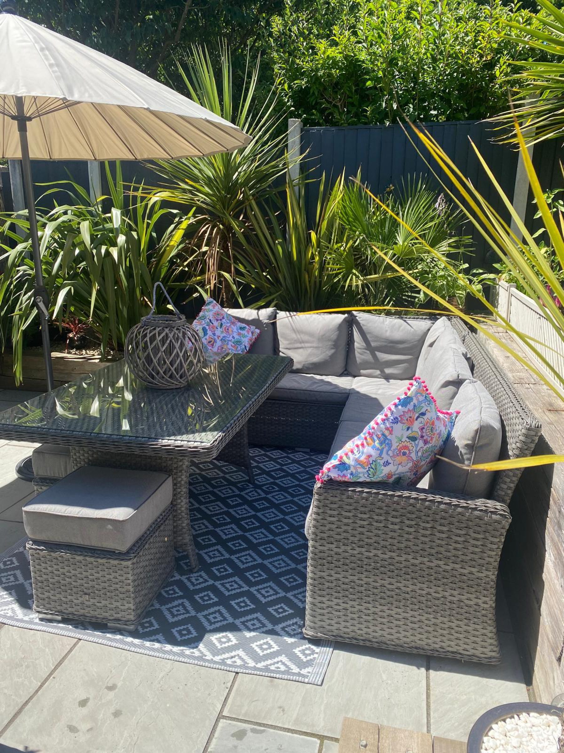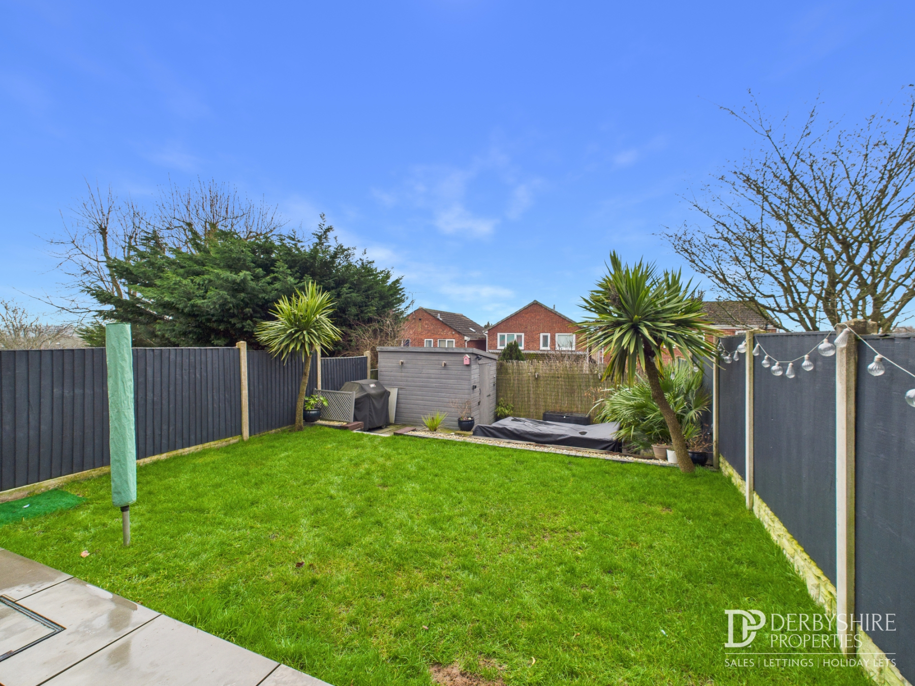 The landscaped rear garden features a full-width sandstone tiled entertaining terrace ideal for outdoor dining, a generous lawn, and a further sun patio housing a timber garden shed. The garden is enclosed by timber fence boundaries and benefits from outside lighting and a water tap.