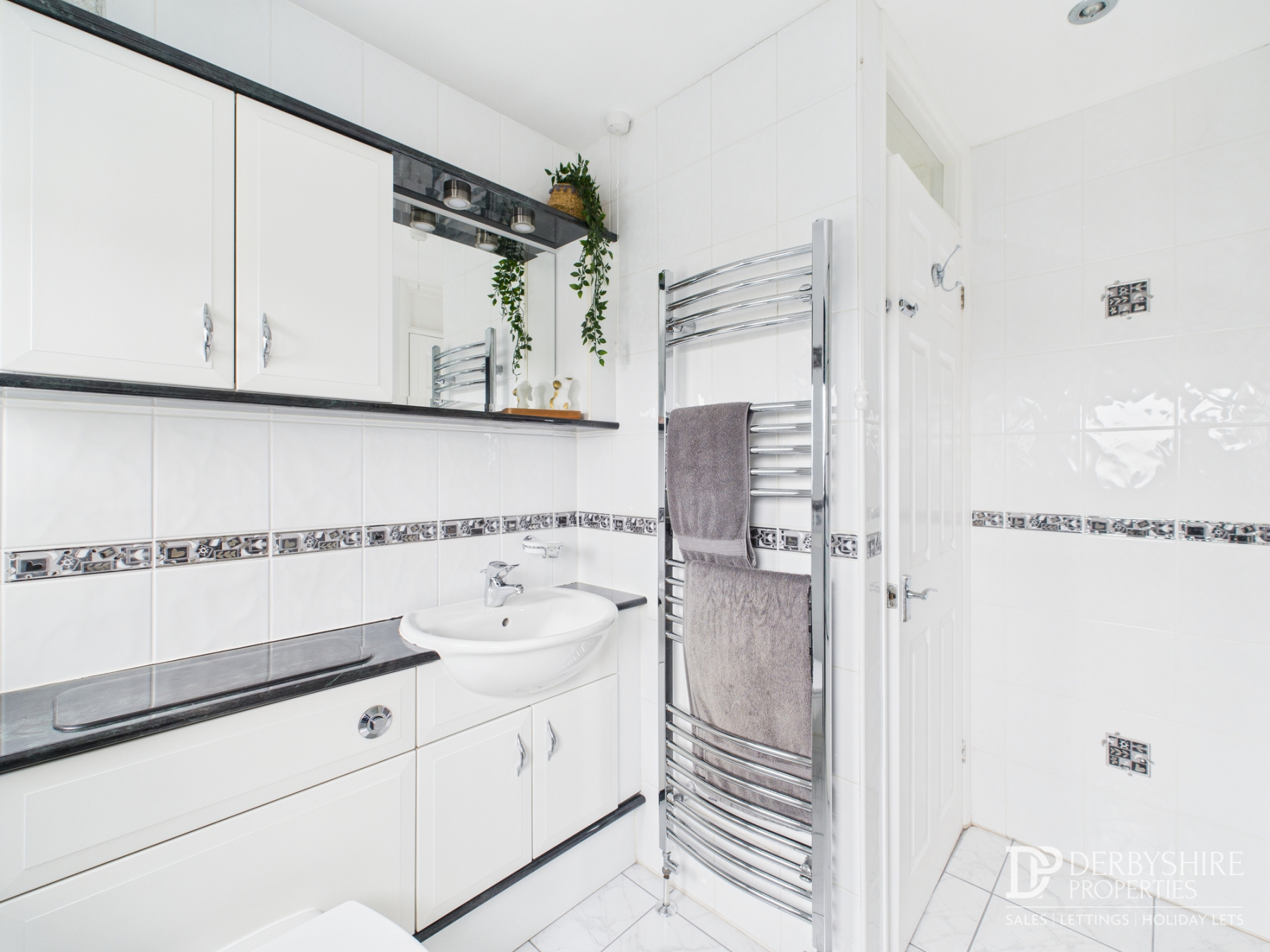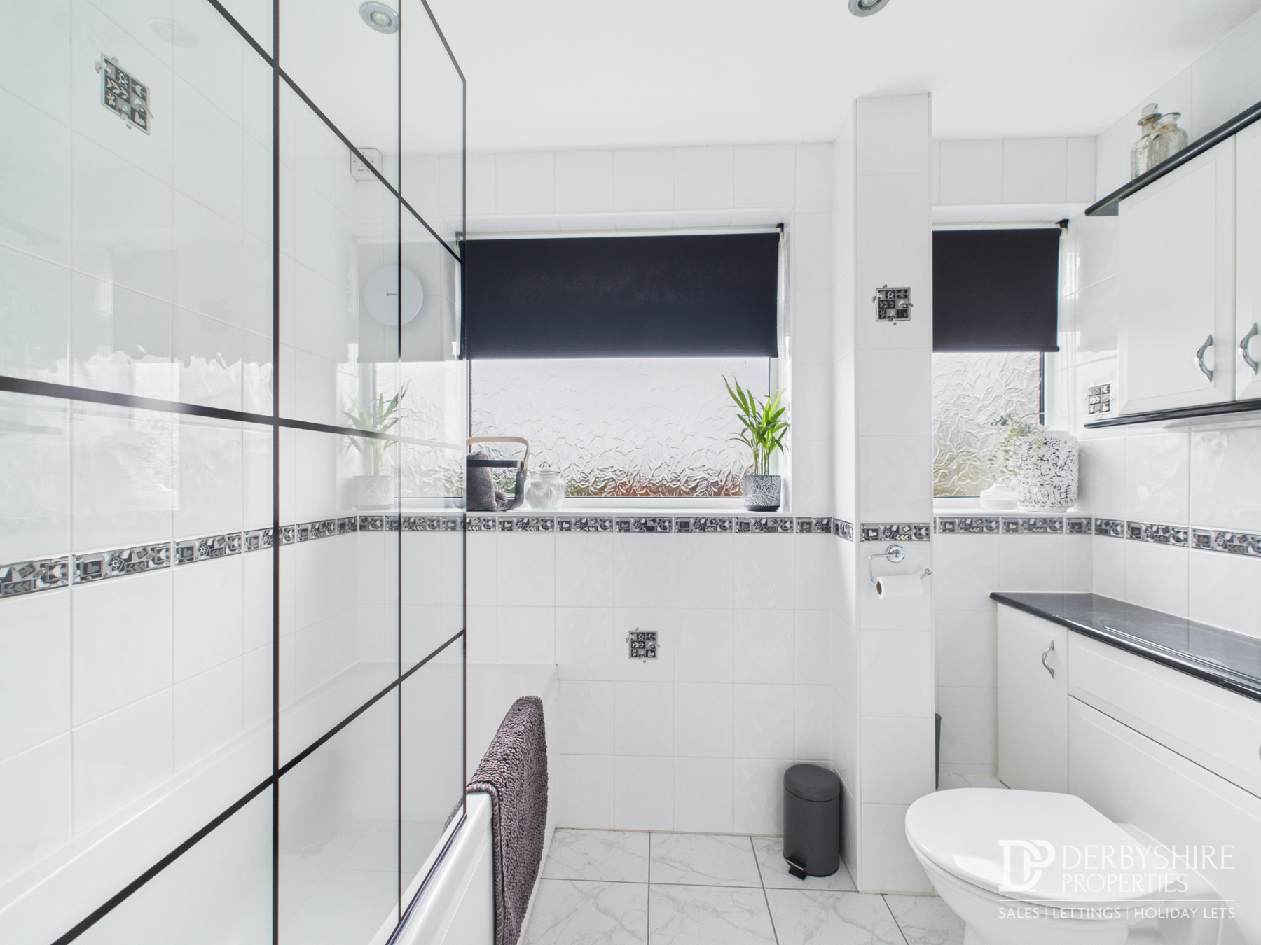 Comprising a modern three-piece suite including an encased WC with vanity unit, bath with electric shower and attachment, and complementary glass shower screen. Finished with tiled walls and flooring, double-glazed window to the rear elevation, chrome heated towel rail, and a useful linen storage cupboard.