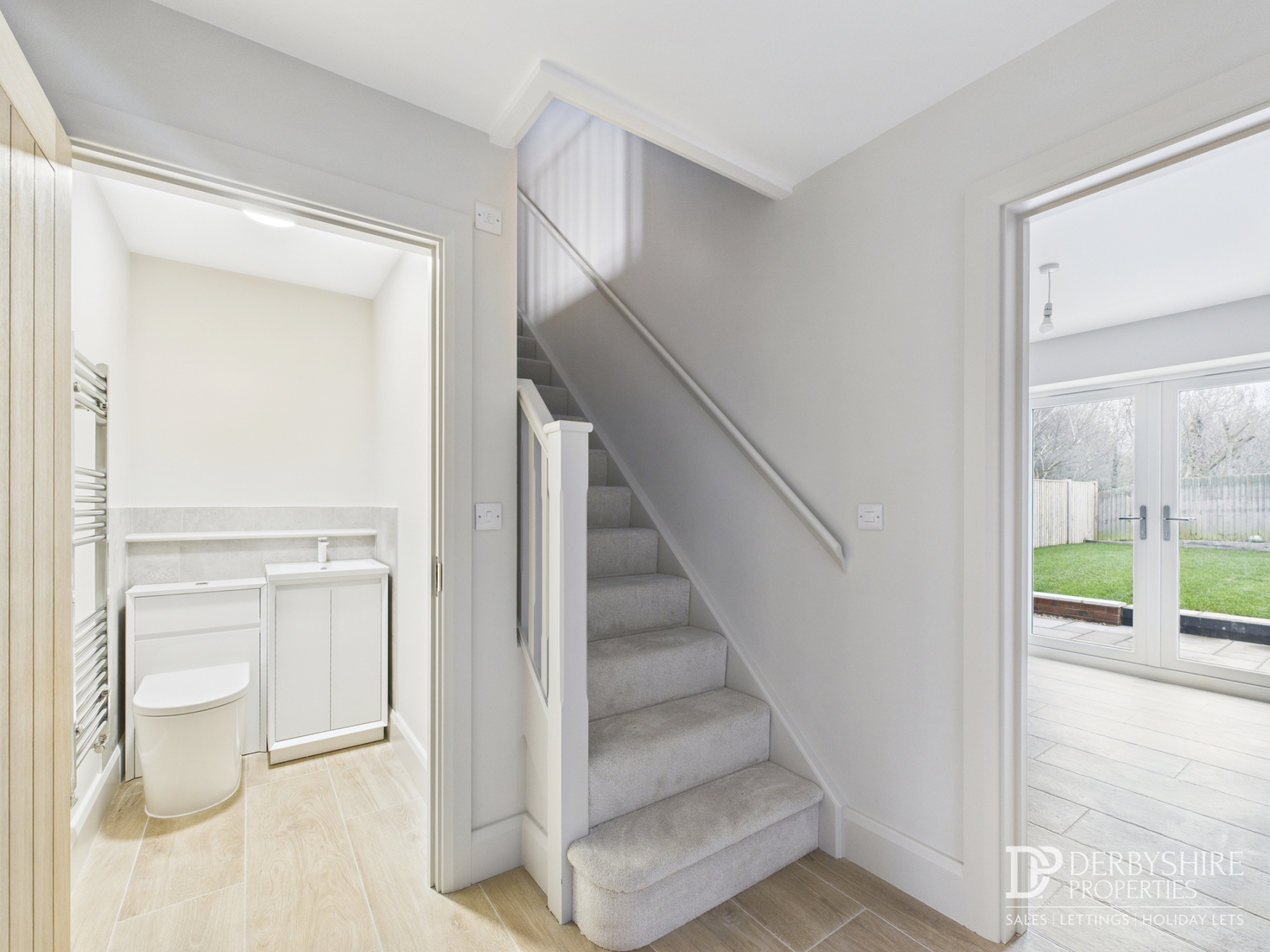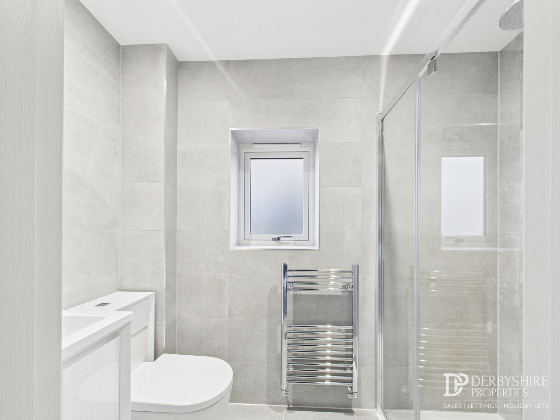 With low level WC and handwash basin with cabinet storage. Wall mounted heated towel rail and tiled splashbacks for units complete the space.