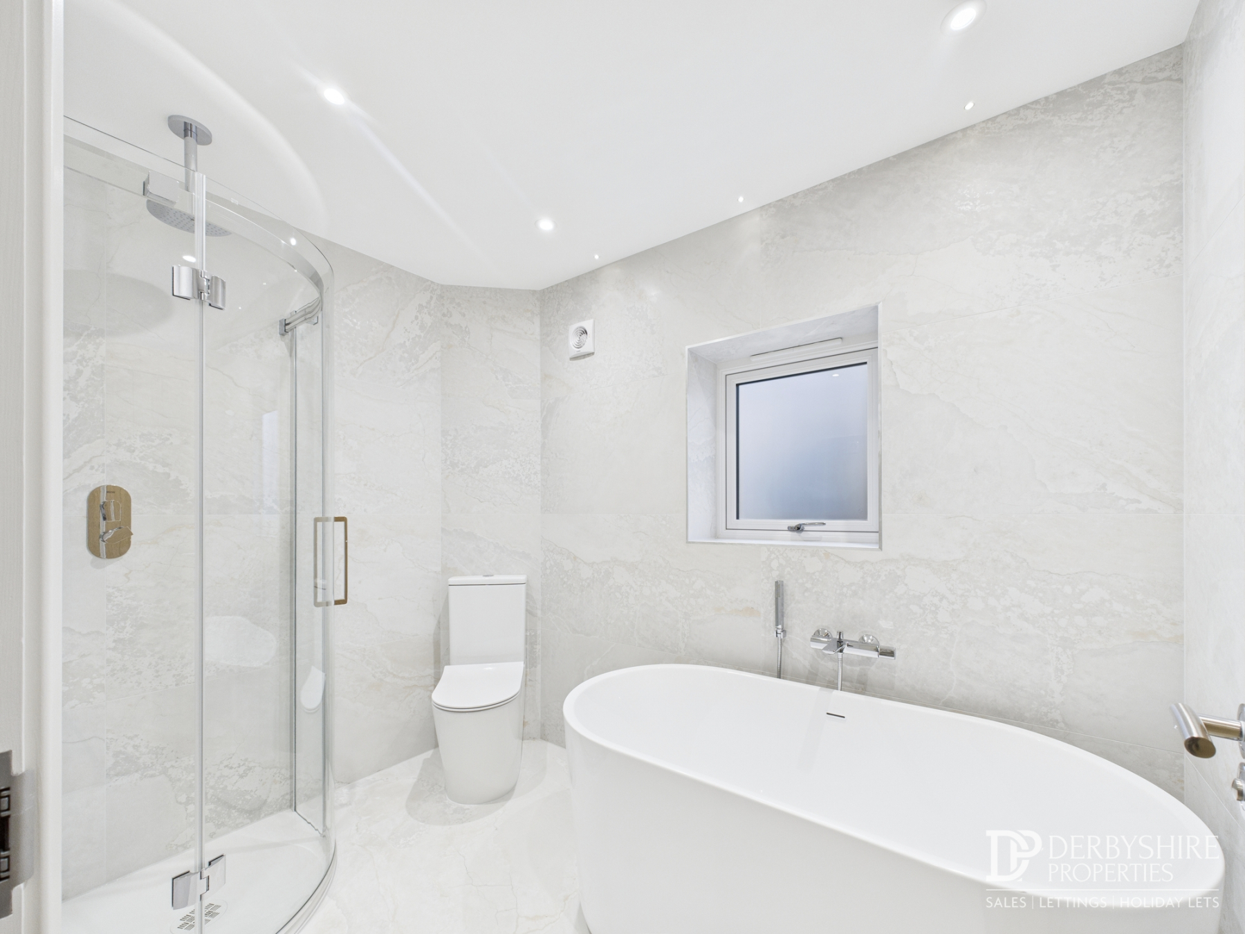 2.65m x 1.78m (8' 8" x 5' 10") A tiled four piece suite including; Corner shower cubicle, freestanding bath, vanity handwash basin and low level WC. Wall mounted heated towel rail, wall fitted extractor unit and double glazed obscured window to side elevation complete the space.