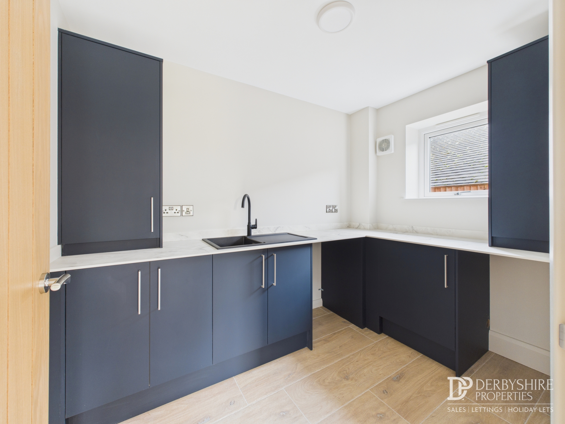 Benefitting from cupboard space, stylish worktops and inset sink of its own, this utility room also benefits from wall mounted radiator, extractor unit and double glazed window to side elevation.