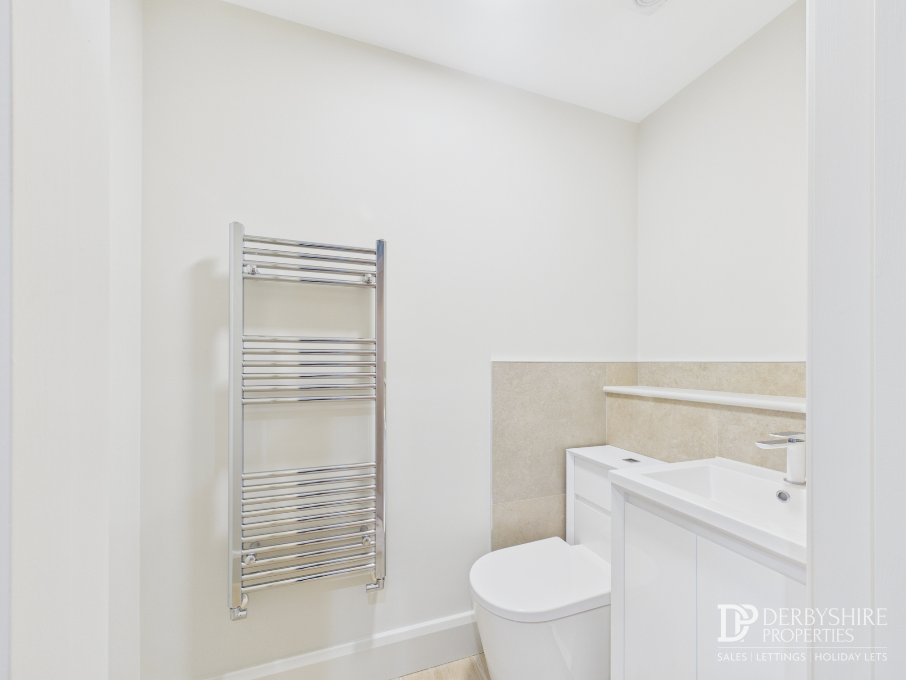 With low level WC and handwash basin with cabinet storage. Wall mounted heated towel rail and tiled splashbacks for units complete the space.