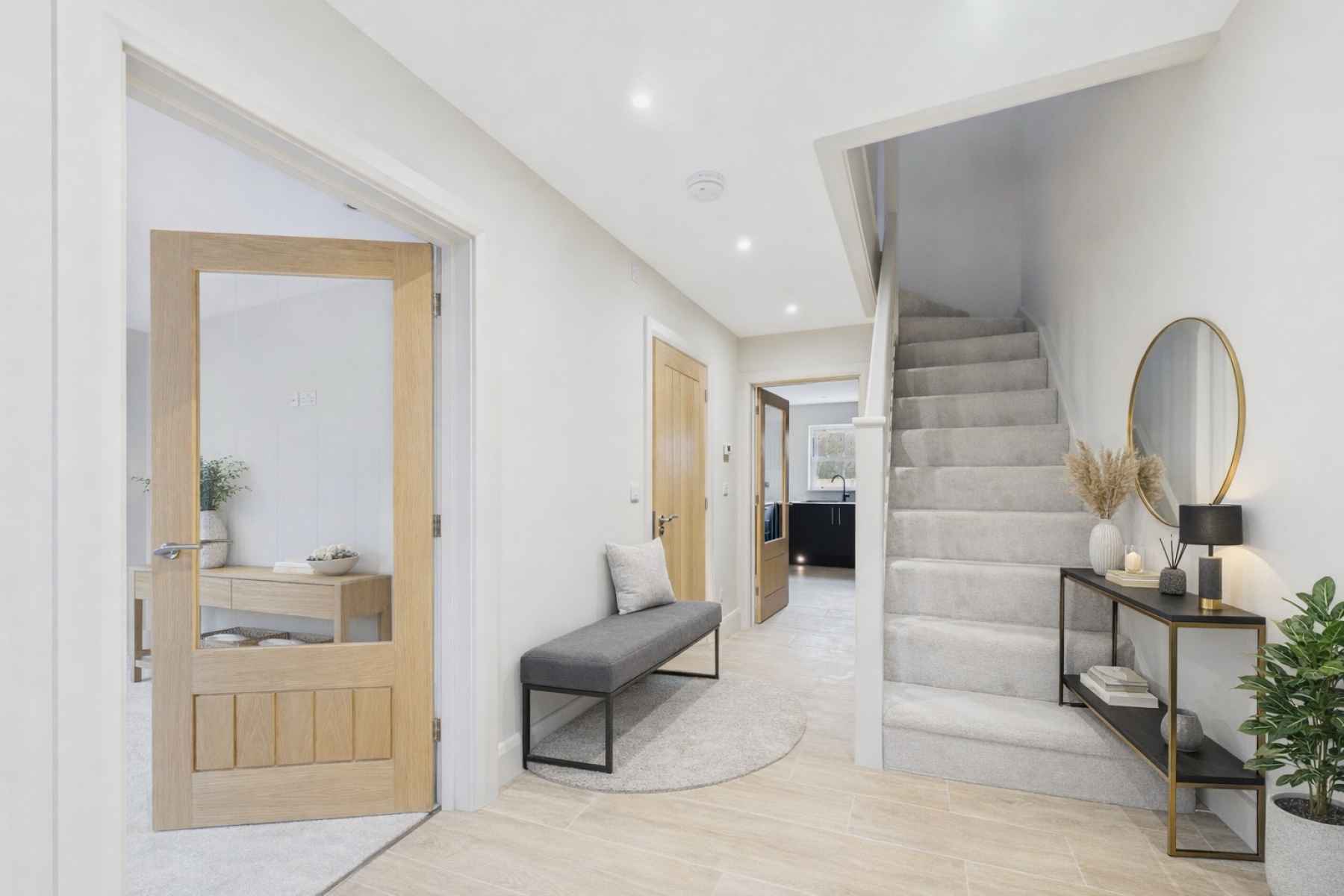 Accessed via composite door to front elevation with tiled effect flooring, wall mounted radiator, carpeted stairs rising to first floor and oak/glass panel doorways to;