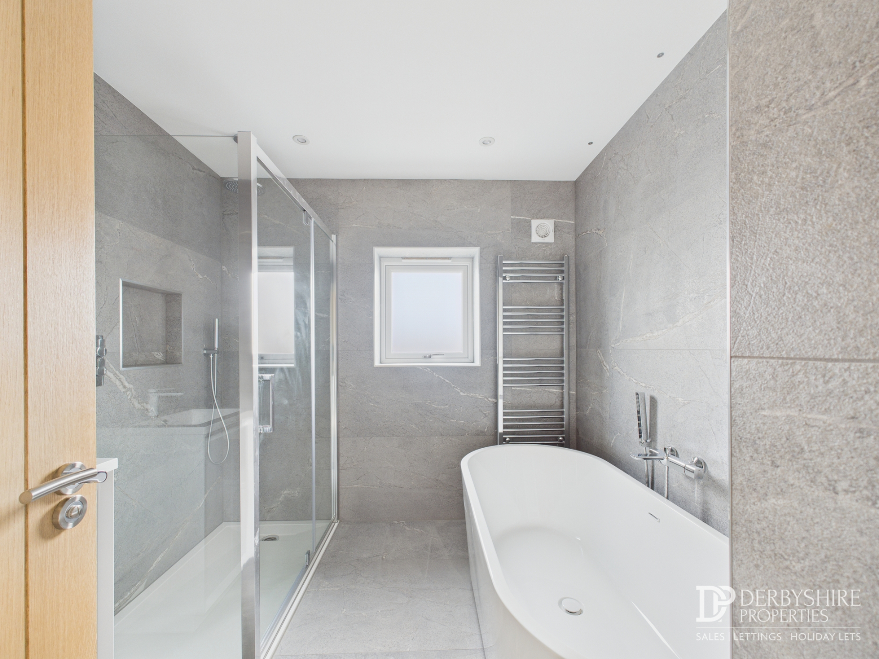 2.52m x 2.42m (8' 3" x 7' 11") A tiled four piece suite including; Corner shower cubicle, freestanding bath, vanity handwash basin and low level WC. Wall mounted heated towel rail, wall fitted extractor unit and double glazed obscured window to side elevation complete the space.