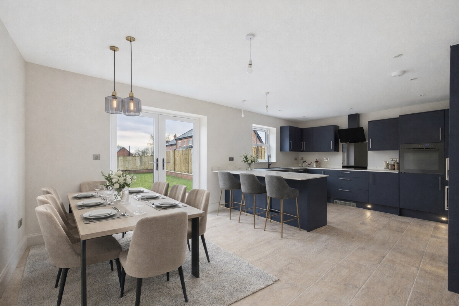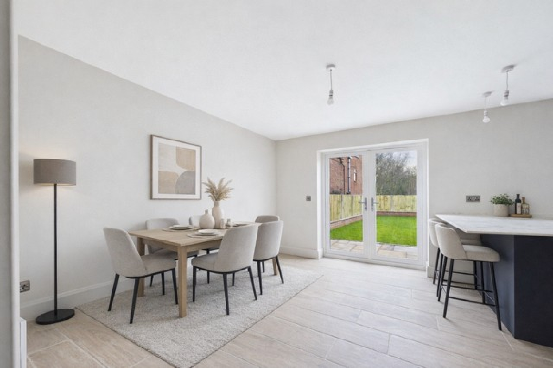 6.24m x 3.92m (20' 6" x 12' 10") A stunning family space with double glazed French doors opening to the patio and double glazed sash window overlooking the garden. The kitchen itself features an attractive range of base cupboards and eye level units with complimentary worktops over and a range of high specification fitted appliances including; Bosch induction hob with accompanying extractor hood, electric oven, inset one and a half bowl sink, dishwasher and double fridge freezer that provides a wealth of storage capacity. Kitchen kickboards benefit from inset lights whilst wood effect flooring extends to the dining/living area where wall mounted radiator and TV point are situated. Access to Utility Room.