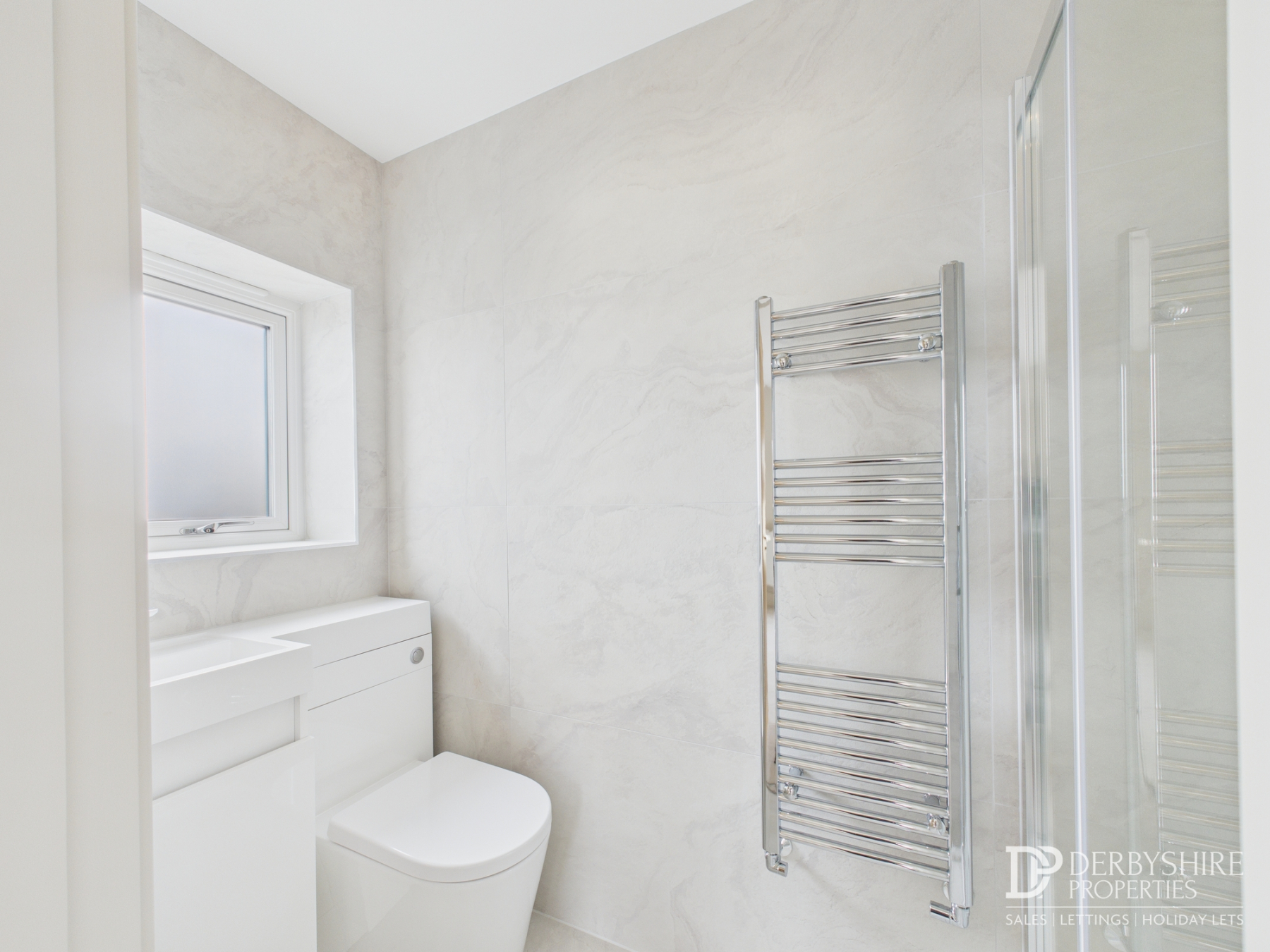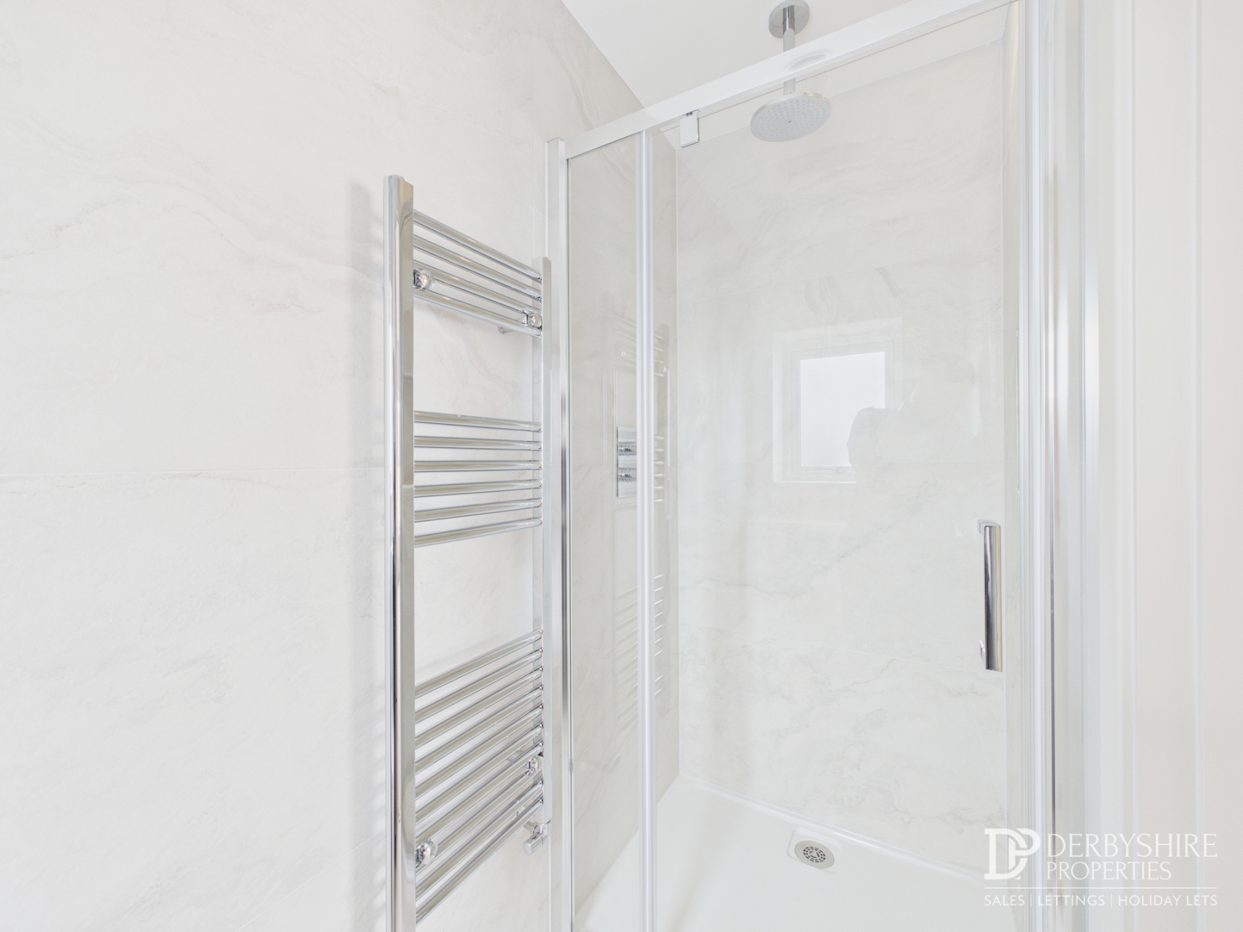 2.51m x 0.99m (8' 3" x 3' 3") A tiled three piece suite including; Shower cubicle with inset shelving, vanity handwash basin and low level WC. Wall mounted heated towel rail, ceiling fitted extractor unit and double glazed window to side elevation completes the space.