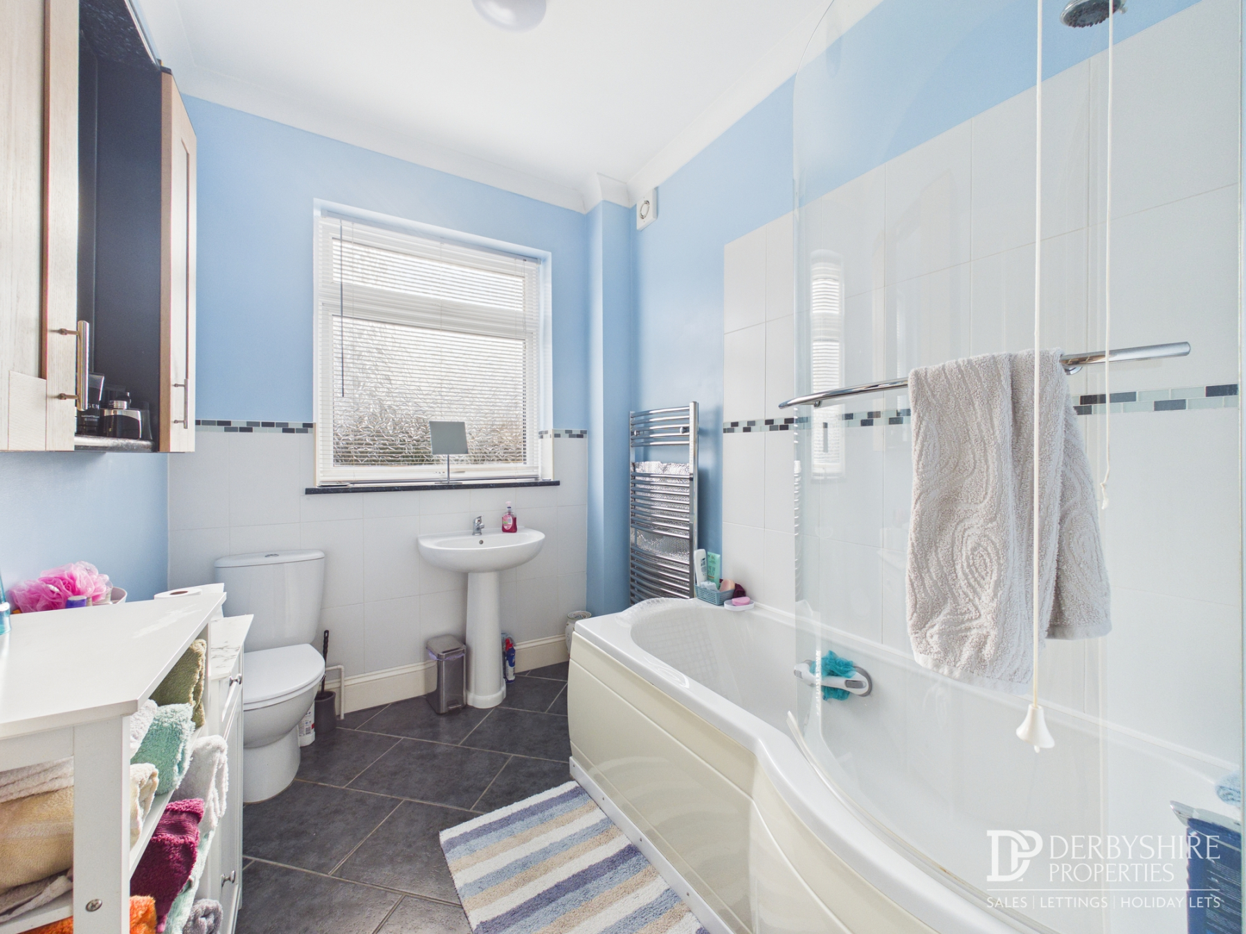 2.69m x 2.08m (8' 10" x 6' 10") A tiled three piece suite including; Bath with shower screen and attachment, pedestal handwash basin and low level WC. Wall mounted heated towel rail and wall fitted extractor unit complete the space.