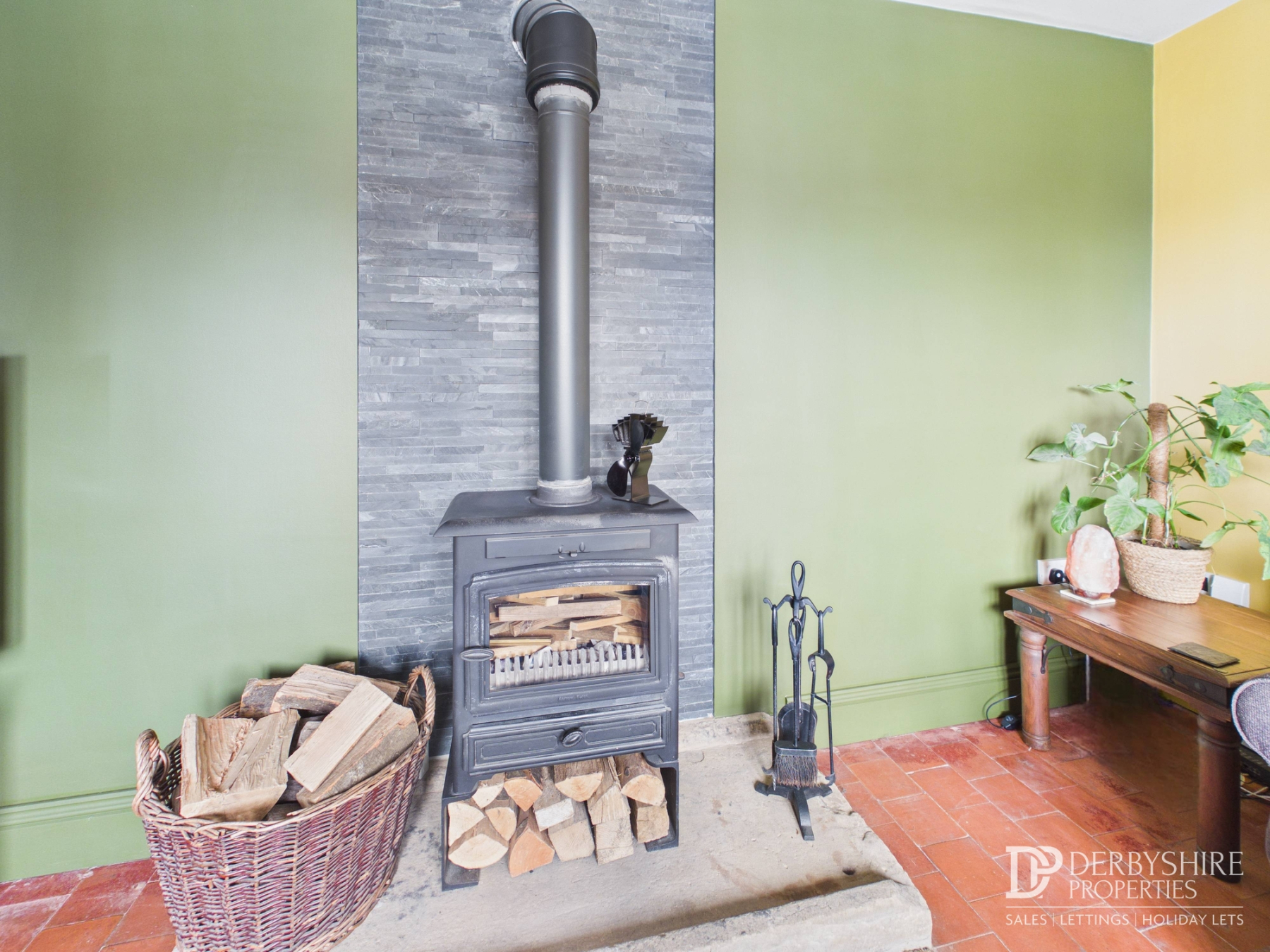 A spacious reception room with a double glazed window to the front elevation, wall-mounted radiator, TV point, and original quarry tiled flooring. The focal point of the room is a cast-iron log burner set against a feature backdrop with raised stone hearth, adding charm and character.