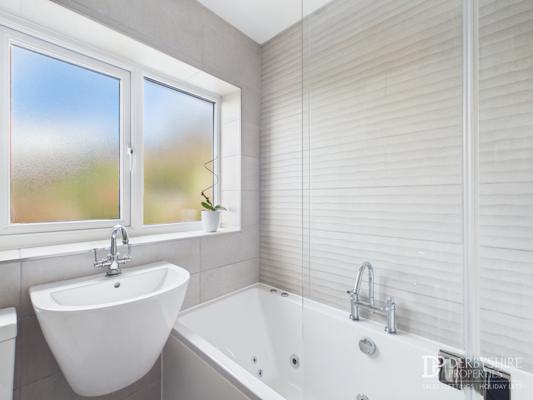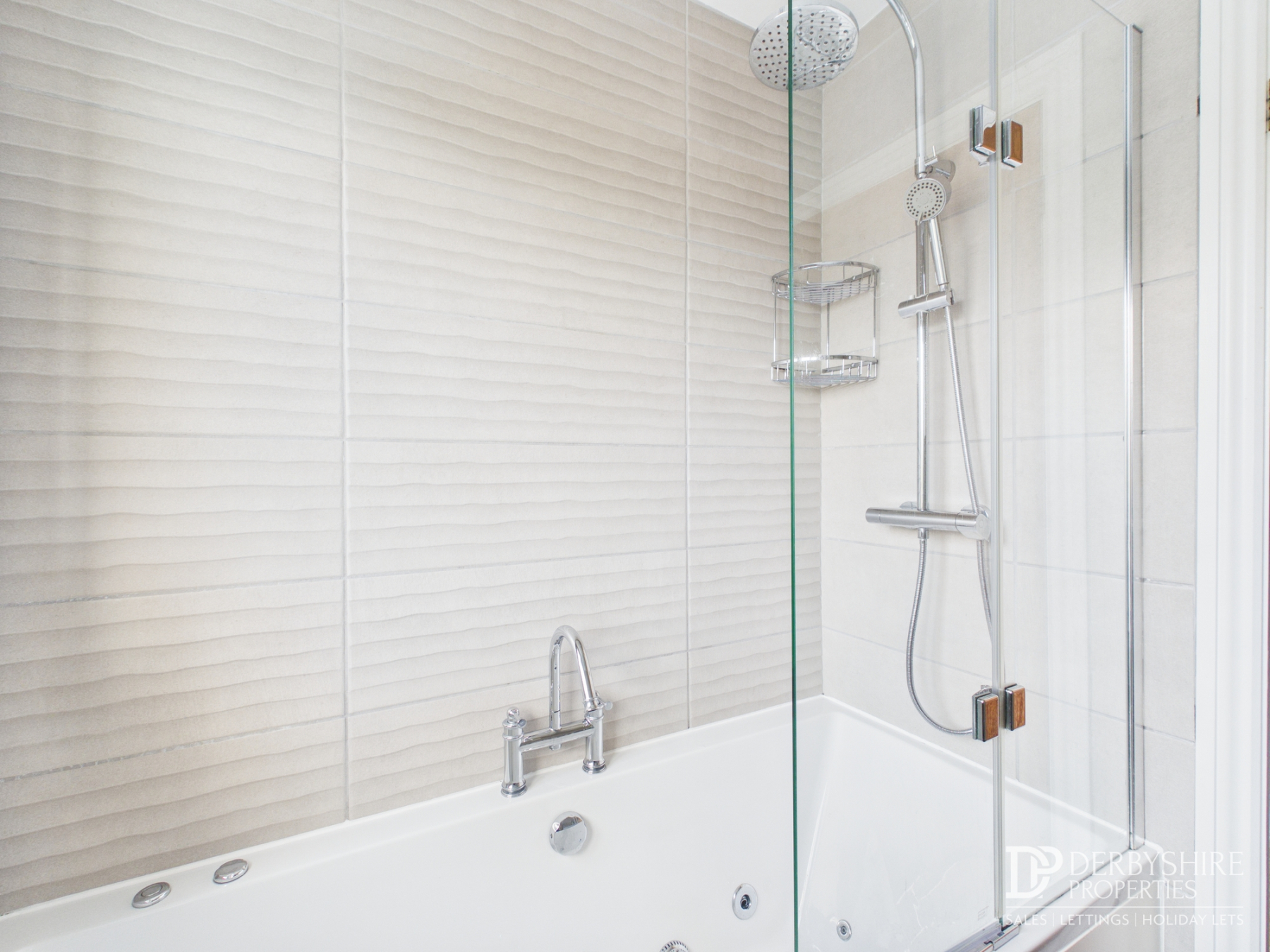 Modern three-piece suite comprising WC, wall-mounted wash hand basin, and spa bath with mains-fed shower and folding glass screen. Finished with attractive tiled walls, wall-mounted heated towel rail/radiator, double glazed obscured window, extractor fan, and ceiling spotlights.