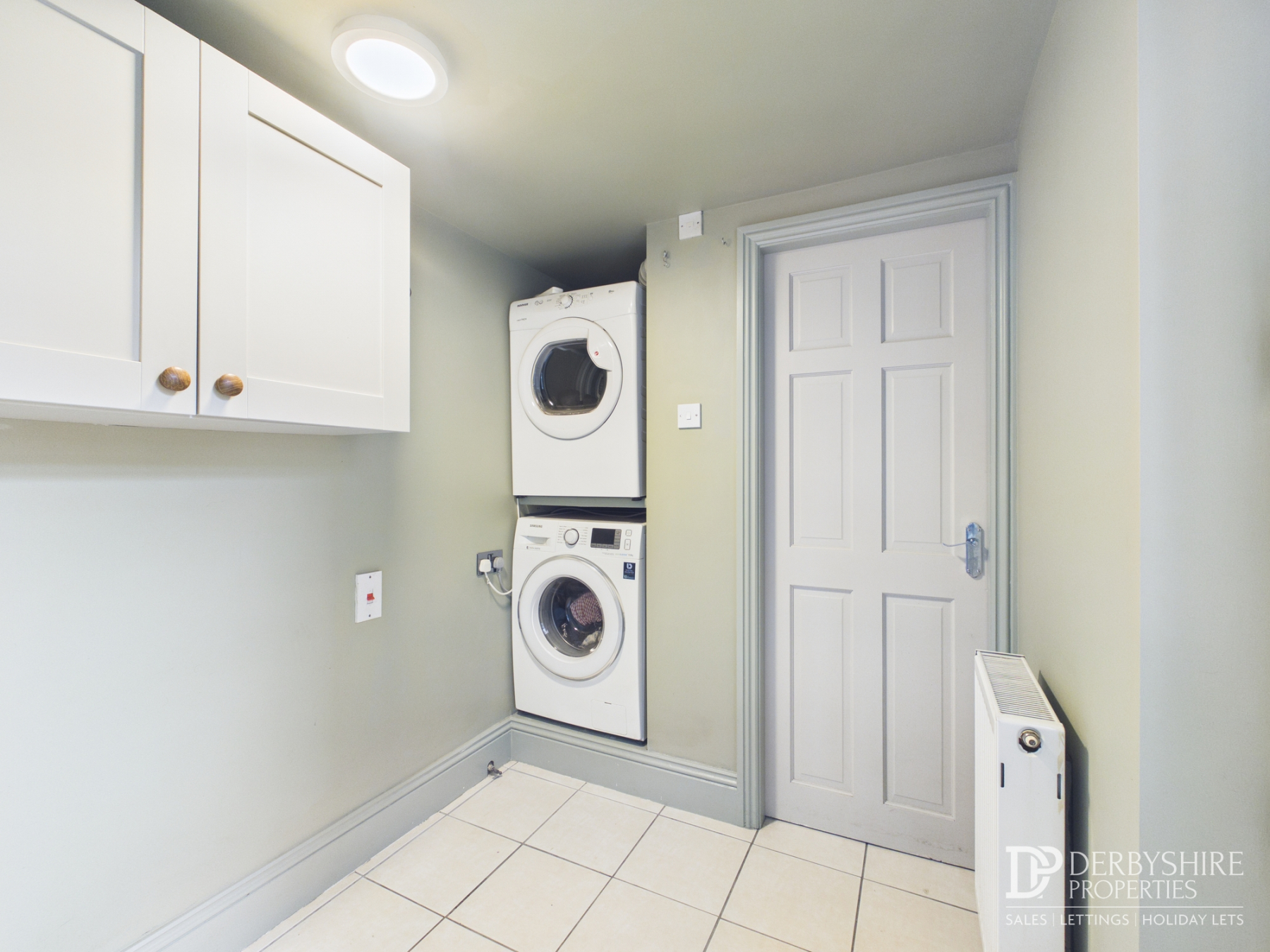 Tiled flooring, wall-mounted storage cupboard, space and plumbing for both washing machine and dryer, wall-mounted radiator, UPVC door to the side elevation, and internal door leading to the guest shower room.
