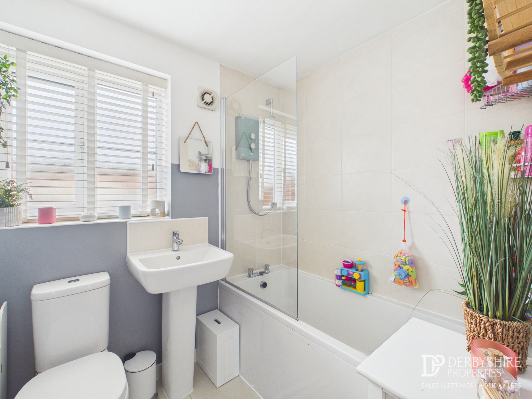 Fitted with a modern three-piece suite comprising low-level WC, pedestal wash hand basin, and panelled bath with shower over and glass screen. Complementary tiling, chrome heated towel rail, tiled flooring, extractor fan, and obscure double glazed window to the side elevation.