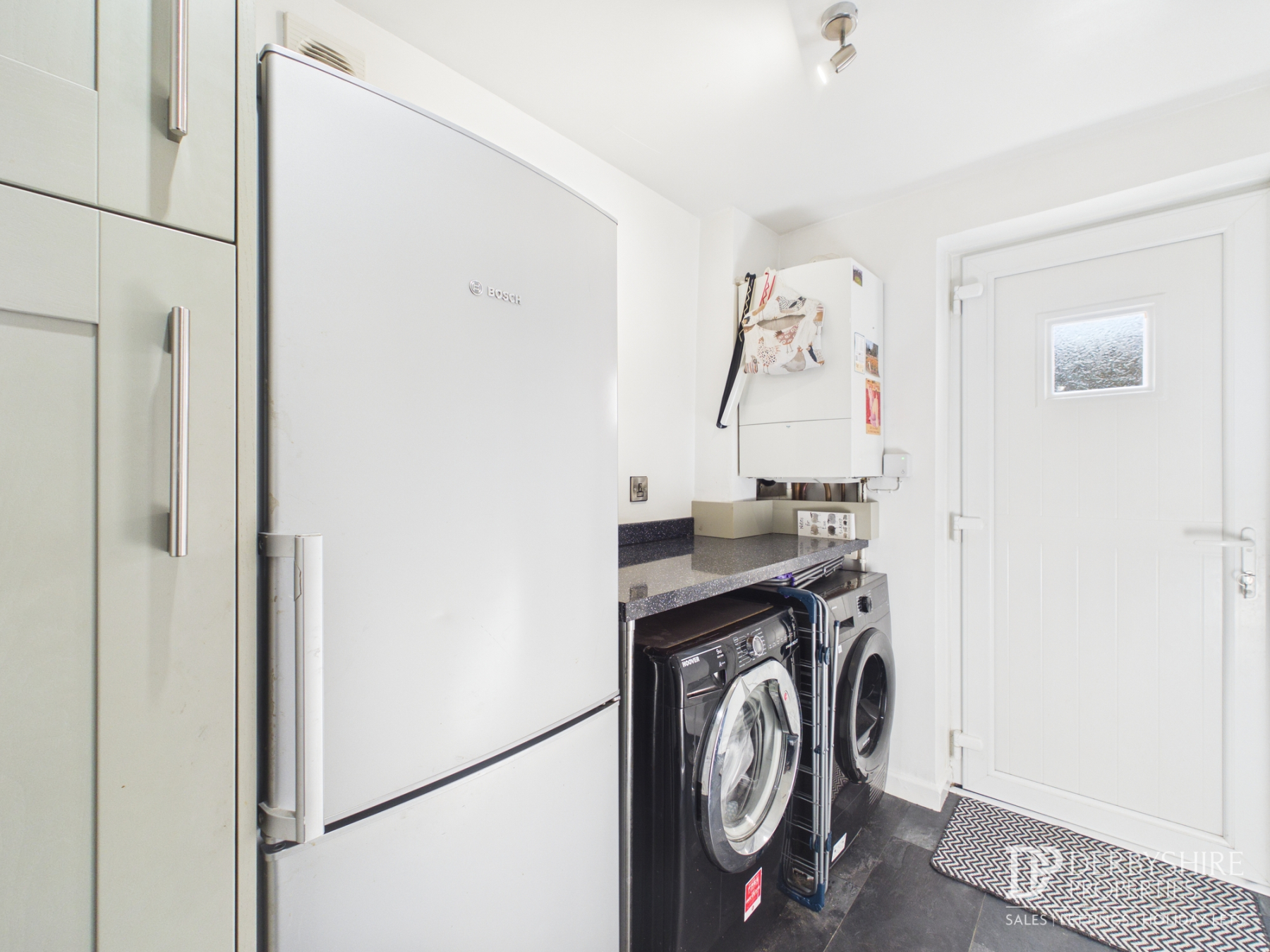 With continuation of the laminate flooring, wall-mounted gas combination boiler, space for a fridge/freezer, and plumbing for a washing machine and tumble dryer. Additional features include a useful storage cupboard, ceiling spotlights, and a UPVC door providing access to the rear garden.