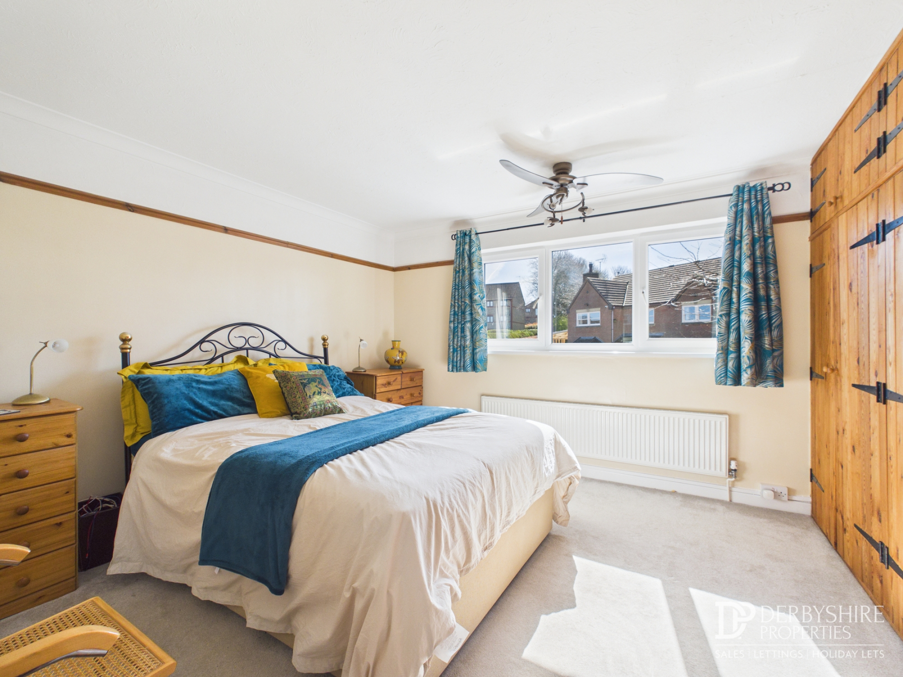 A generous double room with double-glazed window to the rear elevation, wall-mounted radiator, decorative picture rail, and a range of fitted wardrobes providing ample storage.