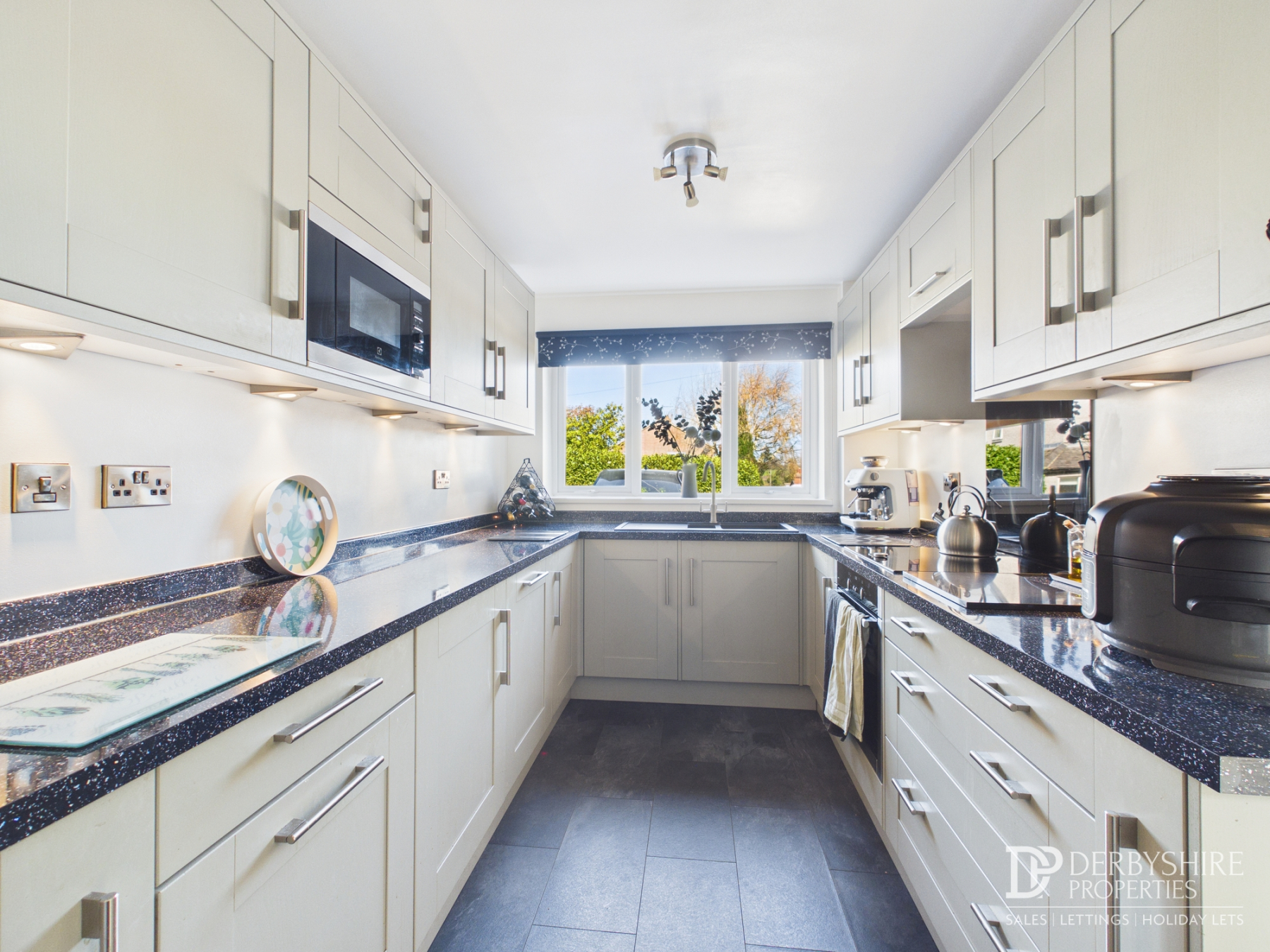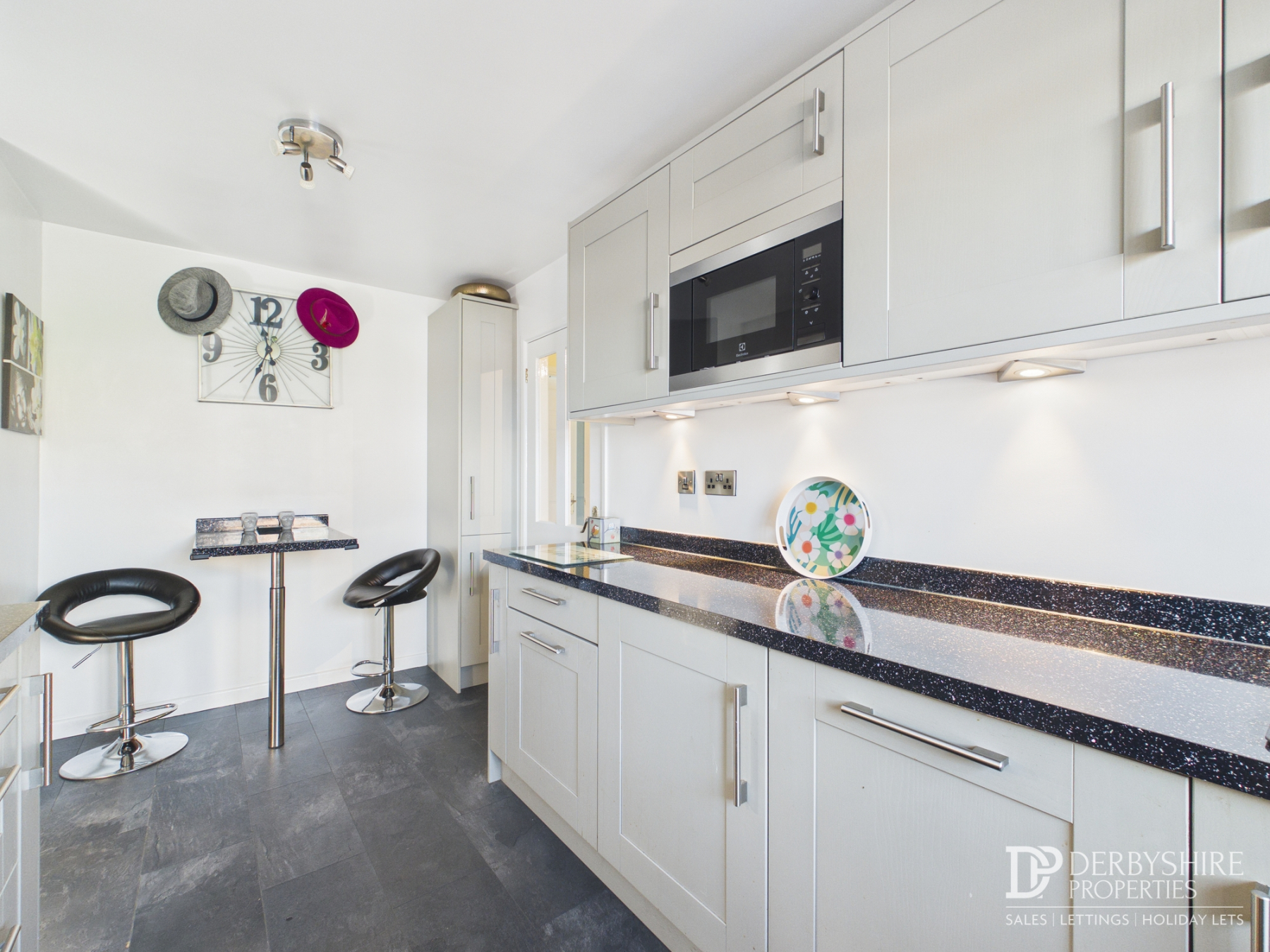 Fitted with a range of matching wall and base units with modern work surfaces incorporating a one-and-a-half bowl sink with mixer tap and splashback. Integrated appliances include an electric oven, induction hob, dishwasher, and microwave. Additional features include under-cupboard lighting, laminate flooring, breakfast bar, and double-glazed window to the front elevation.