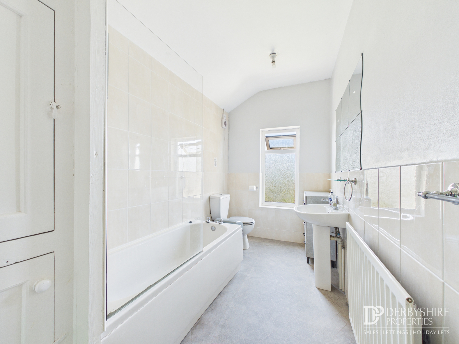 A tiled three piece suite comprising; Bath with shower screen and attachment, pedestal handwash basin and low level WC. Wall mounted radiator, wall fitted extractor unit, fitted airing cupboard and double glazed obscured window to rear elevation completes the space.