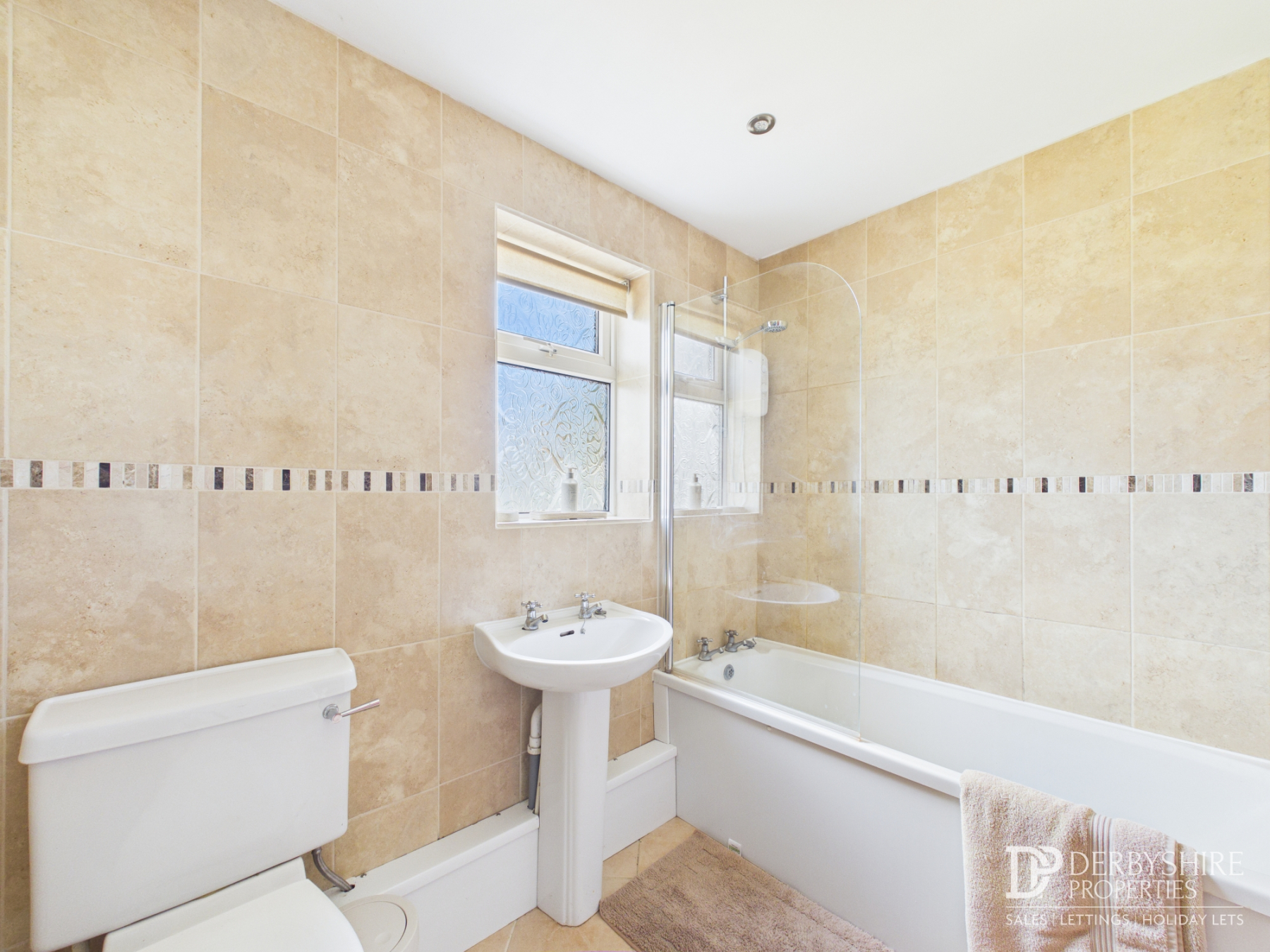 2.36m x 1.63m (7' 9" x 5' 4") A tiled three piece suite comprising; Bath with shower screen and attachment, pedestal handwash basin and low level WC. Wall mounted heated towel rail, wall fitted extractor unit and obscured double glazed window to rear elevation completes the space.