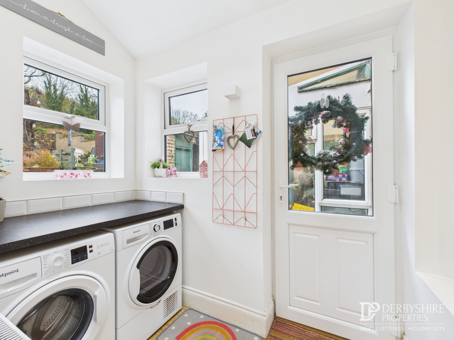 A useful addition accessed via a UPVC door to the side elevation. Wood-effect flooring, wall-mounted radiator, double-glazed windows to the rear and side elevations, and a fitted work surface with space and plumbing for a washing machine and tumble dryer beneath.