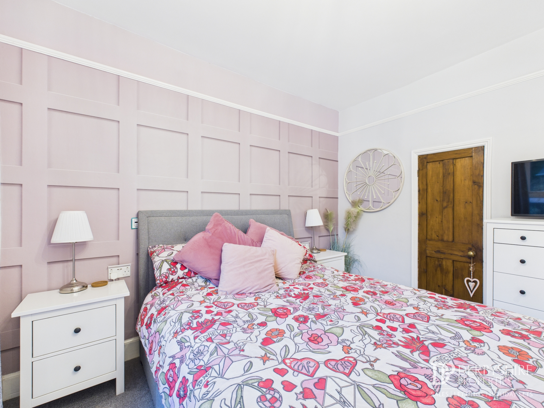 Double-glazed window to the rear elevation, wall-mounted radiator, feature panelled wall, TV point and useful over-stairs storage cupboard.