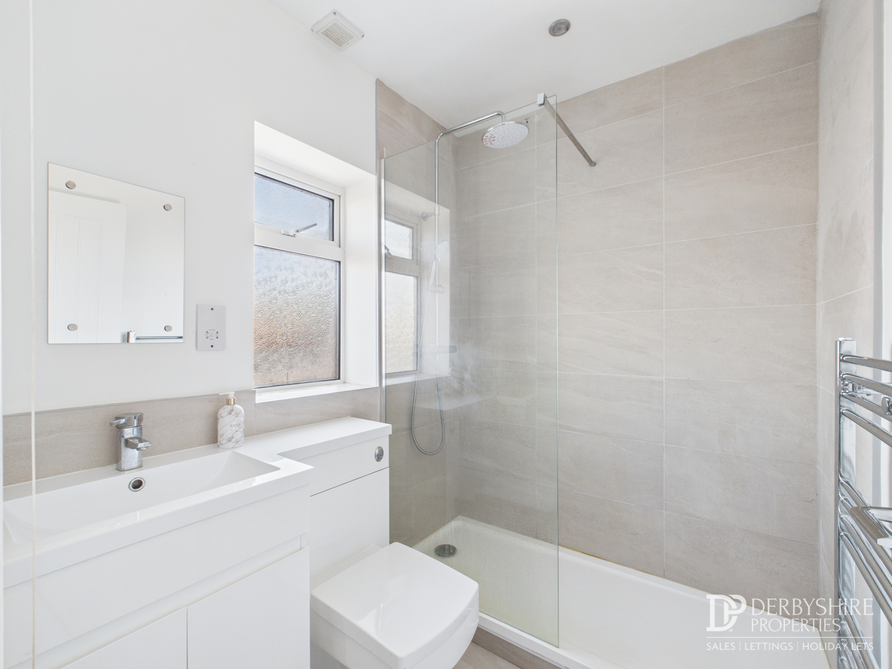 This beautifully fitted modern shower room comprises an encased WC with attached vanity unit and inset sink with tiled splashback. A large shower enclosure houses a mains-fed shower with attachment and complementary glass screen. Additional features include part-tiled walls, chrome heated towel rail, tiled floor covering, ceiling-mounted extractor fan, wall-mounted electric shaver point and a double-glazed obscured window.