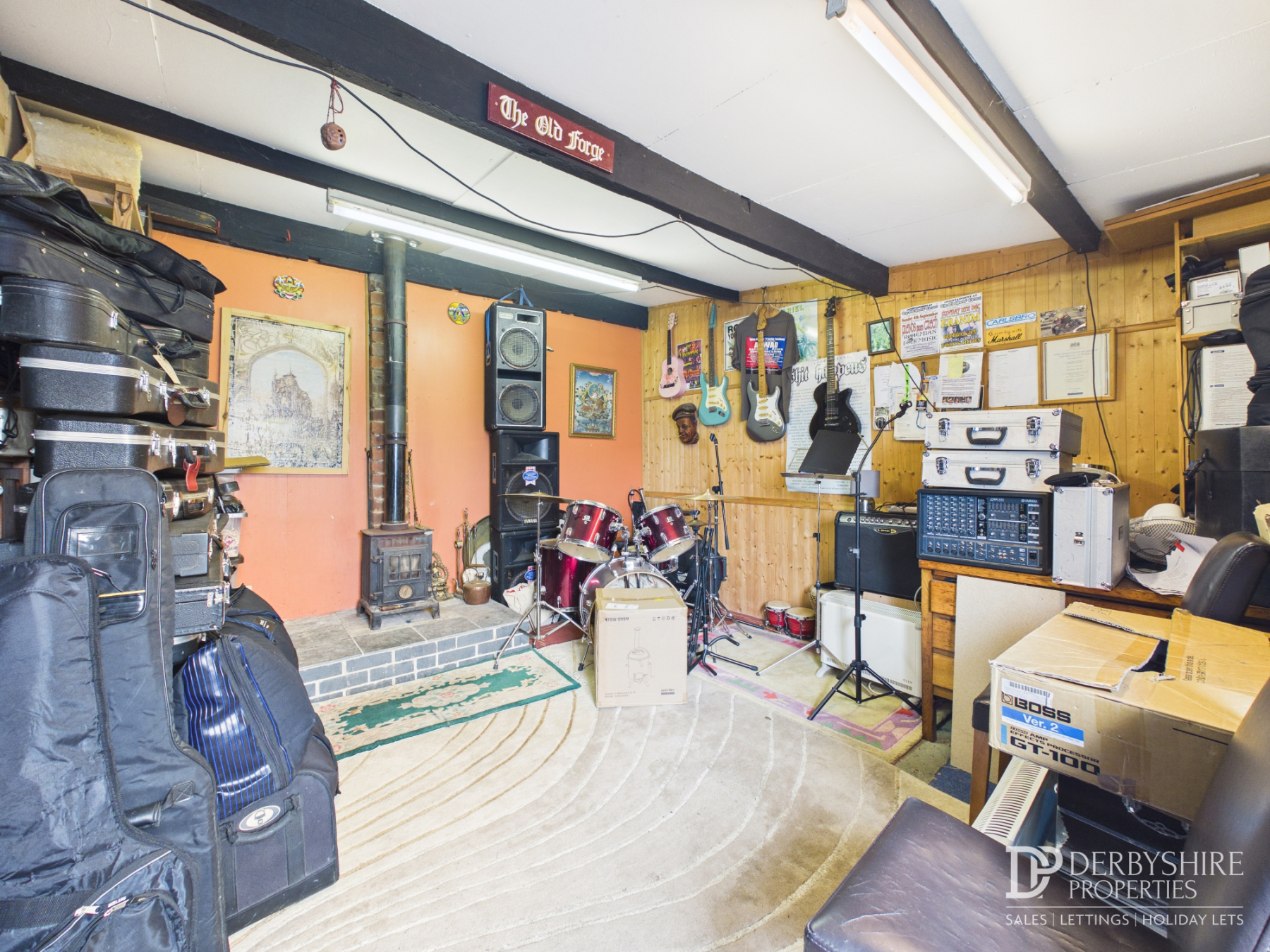used as a music room, with a window and door to the front and a wood-burning stove. This