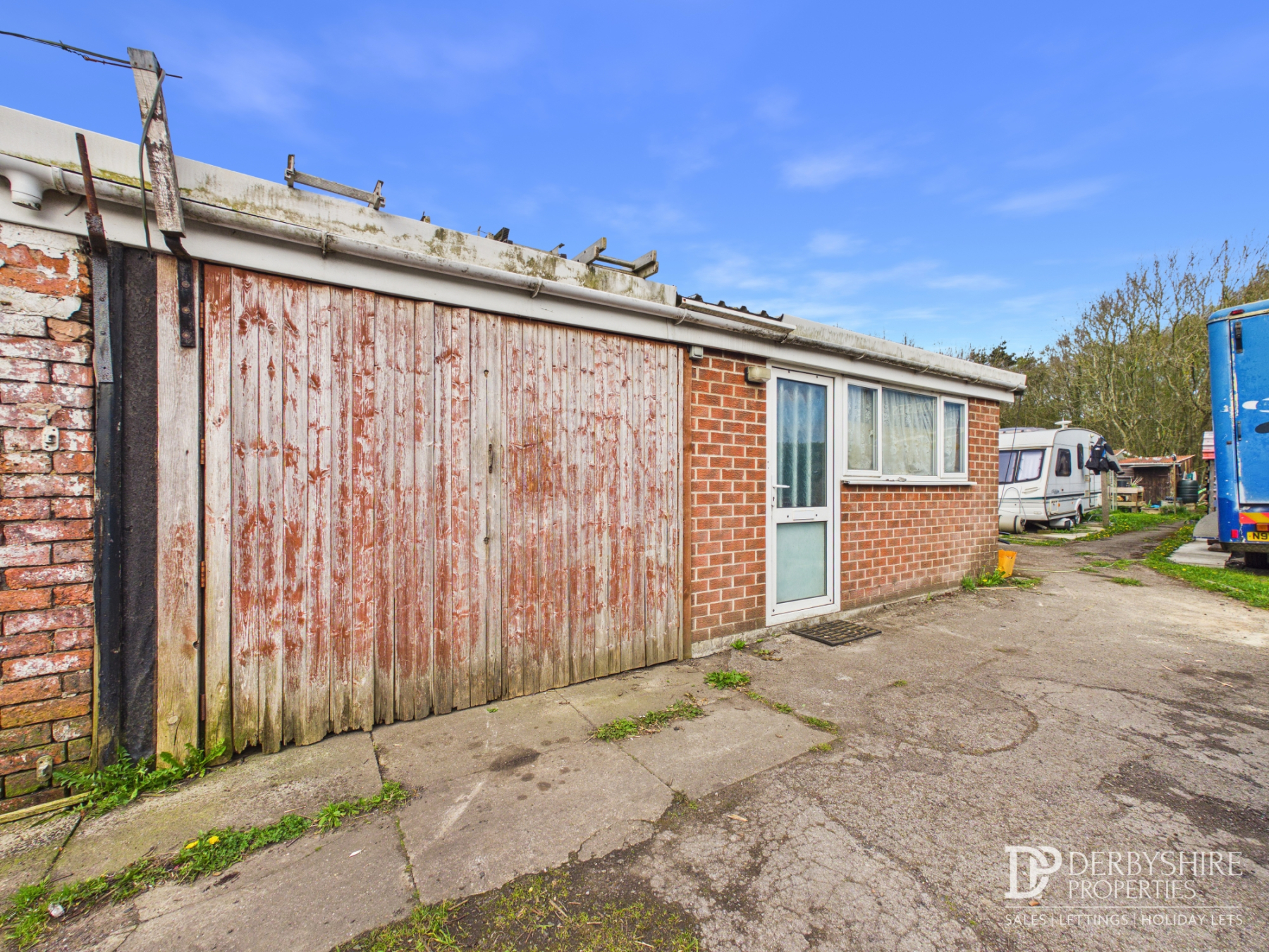 vehicles and a building containing a small garage and workshop. The workshop is currently