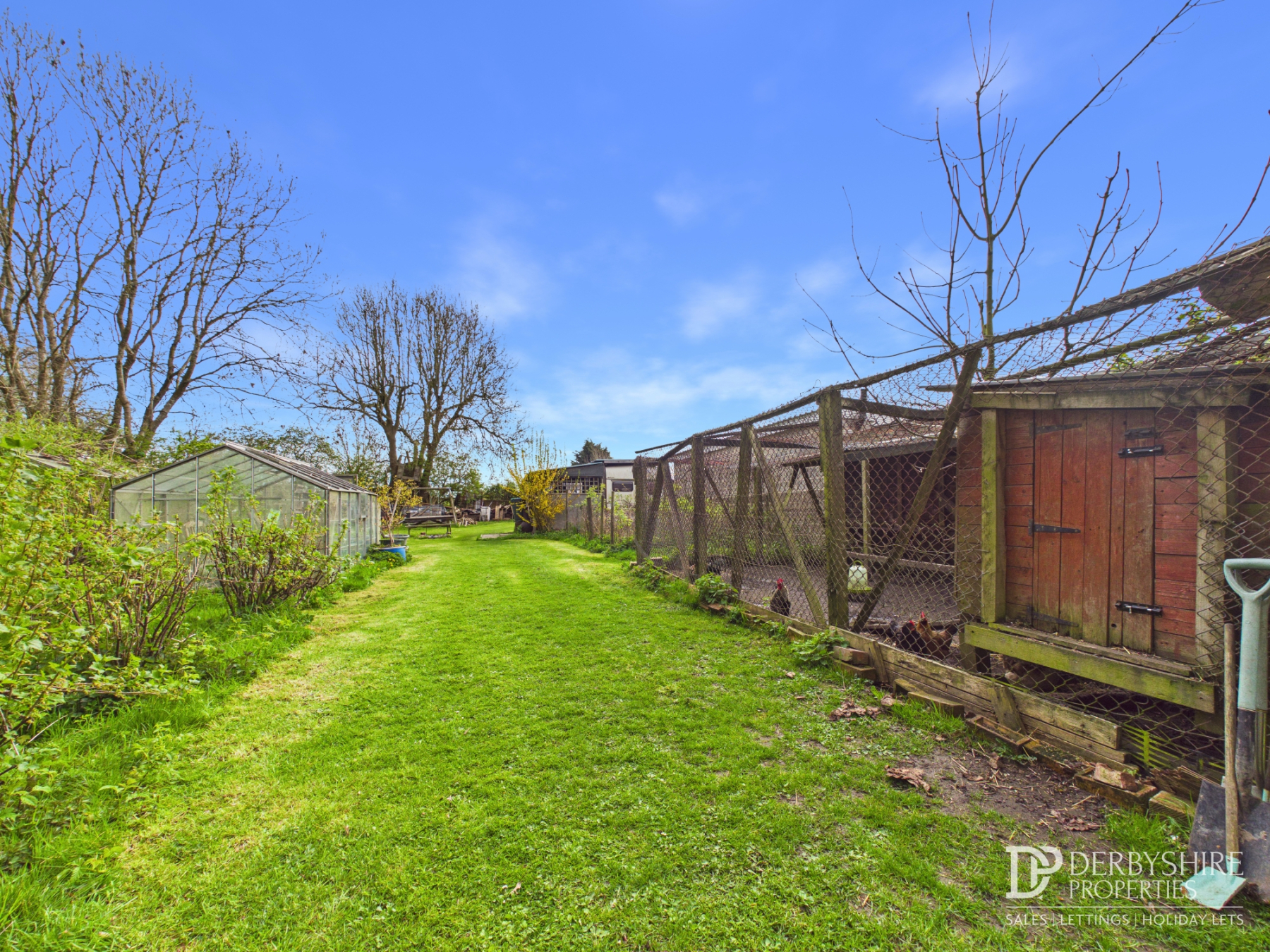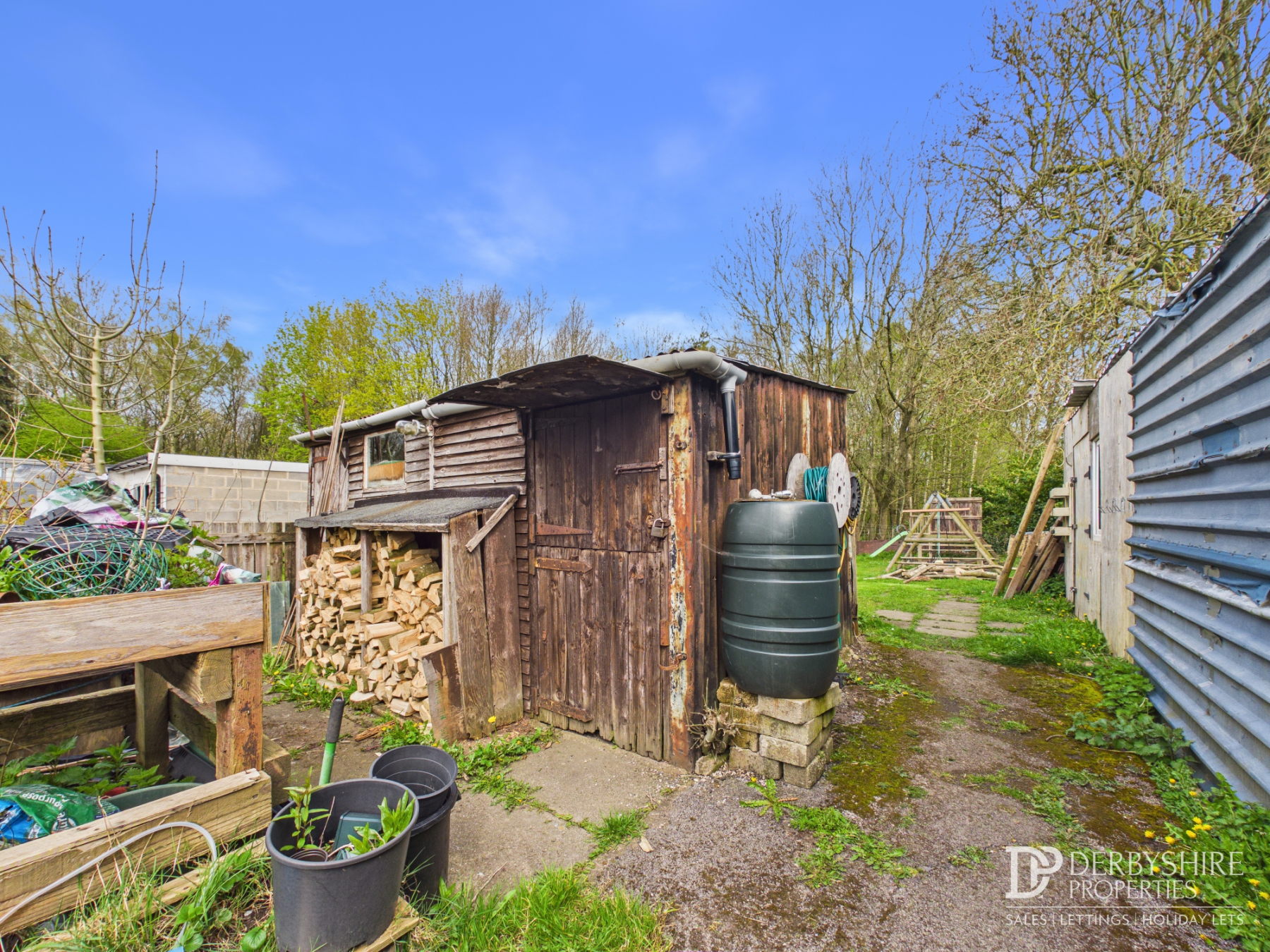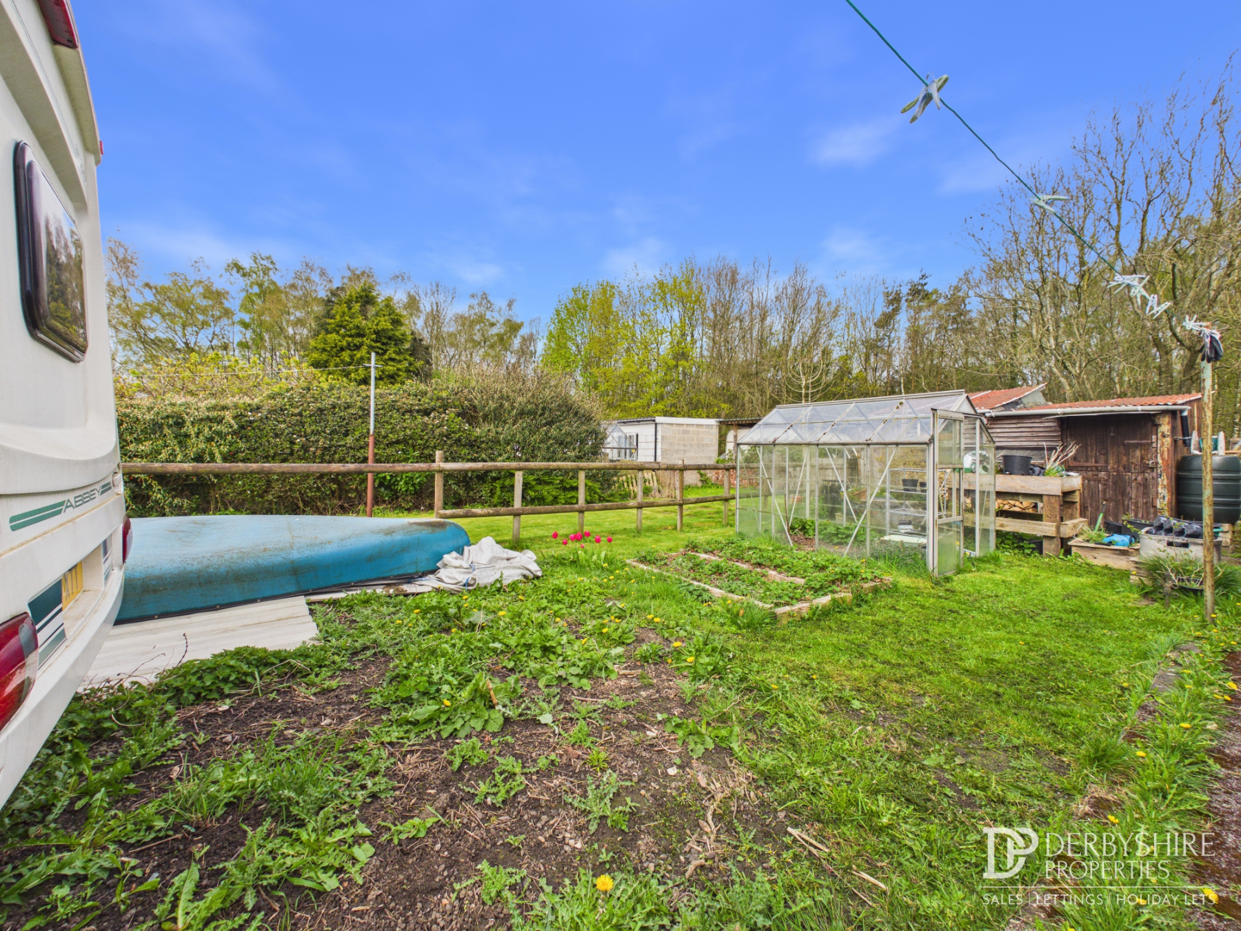 garden area with a veg plot, greenhouse and twin stables/sheds of corrugated steel panels.