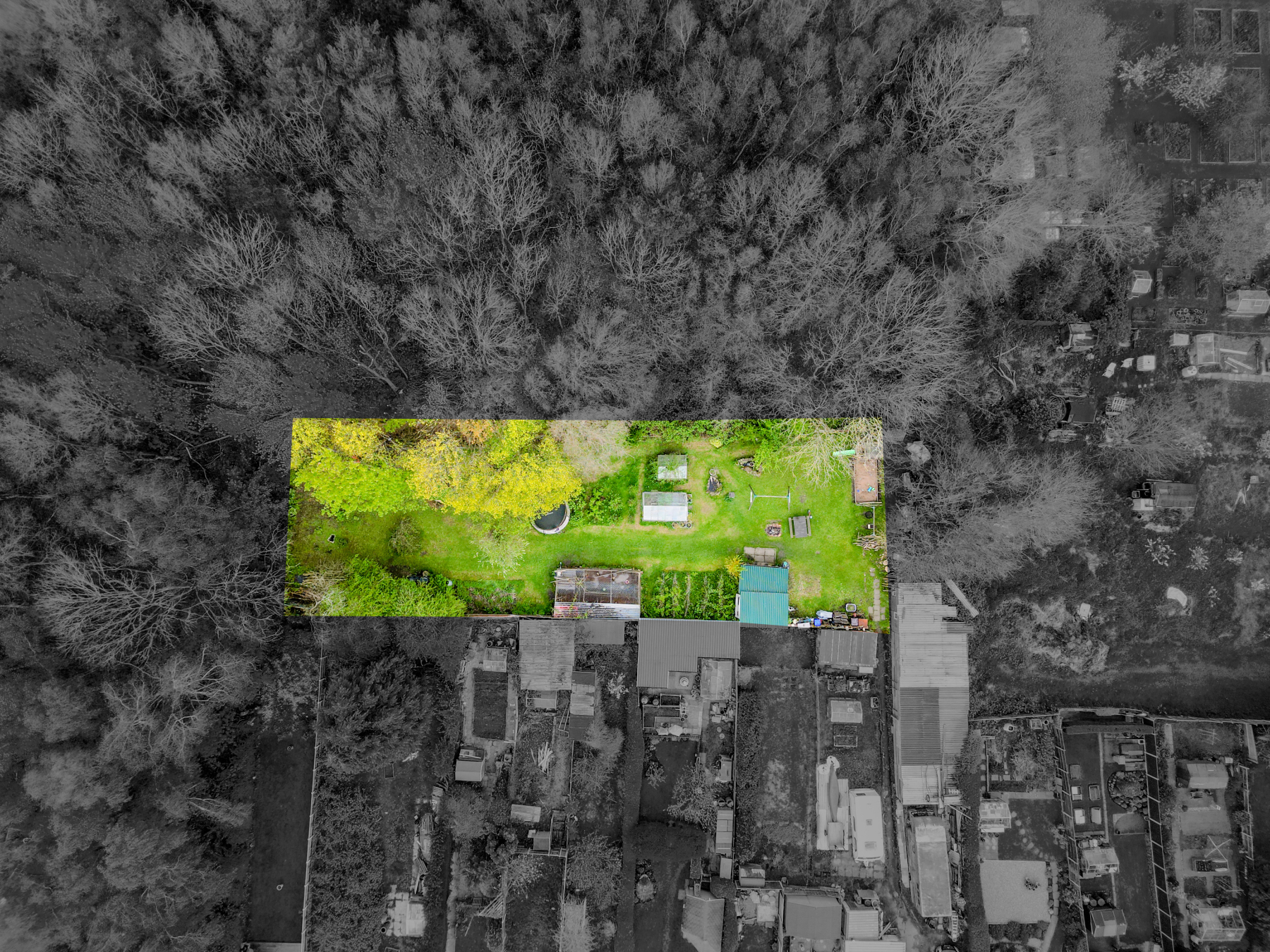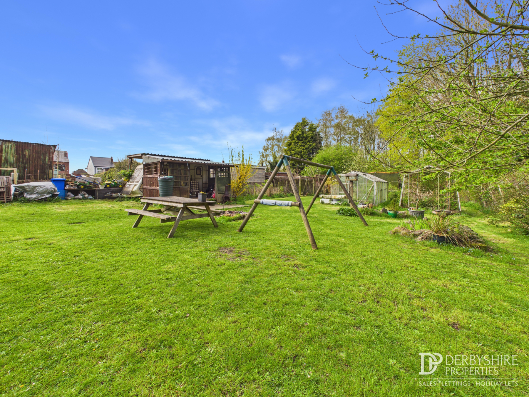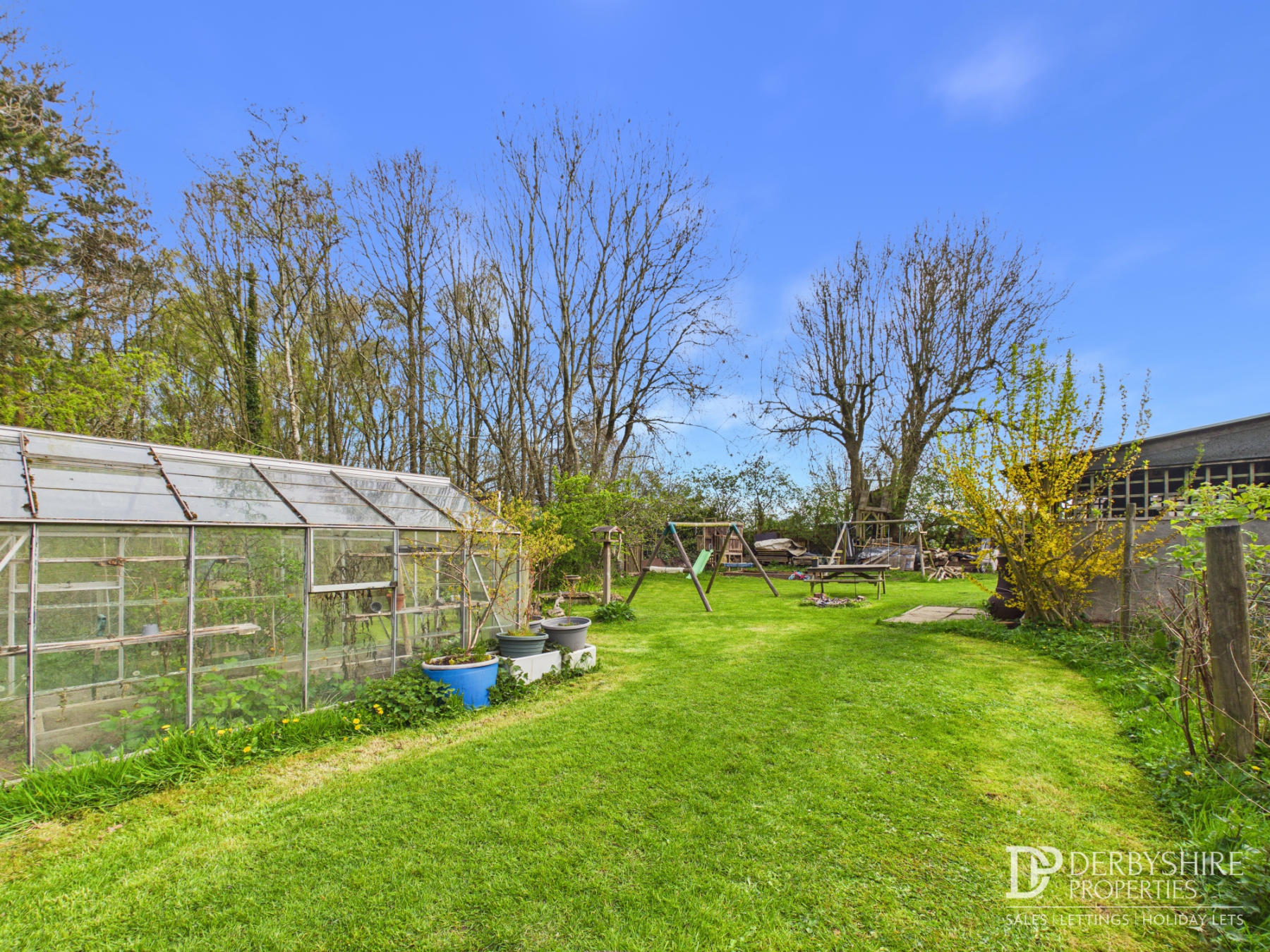 garden area with a veg plot, greenhouse and twin stables/sheds of corrugated steel panels.