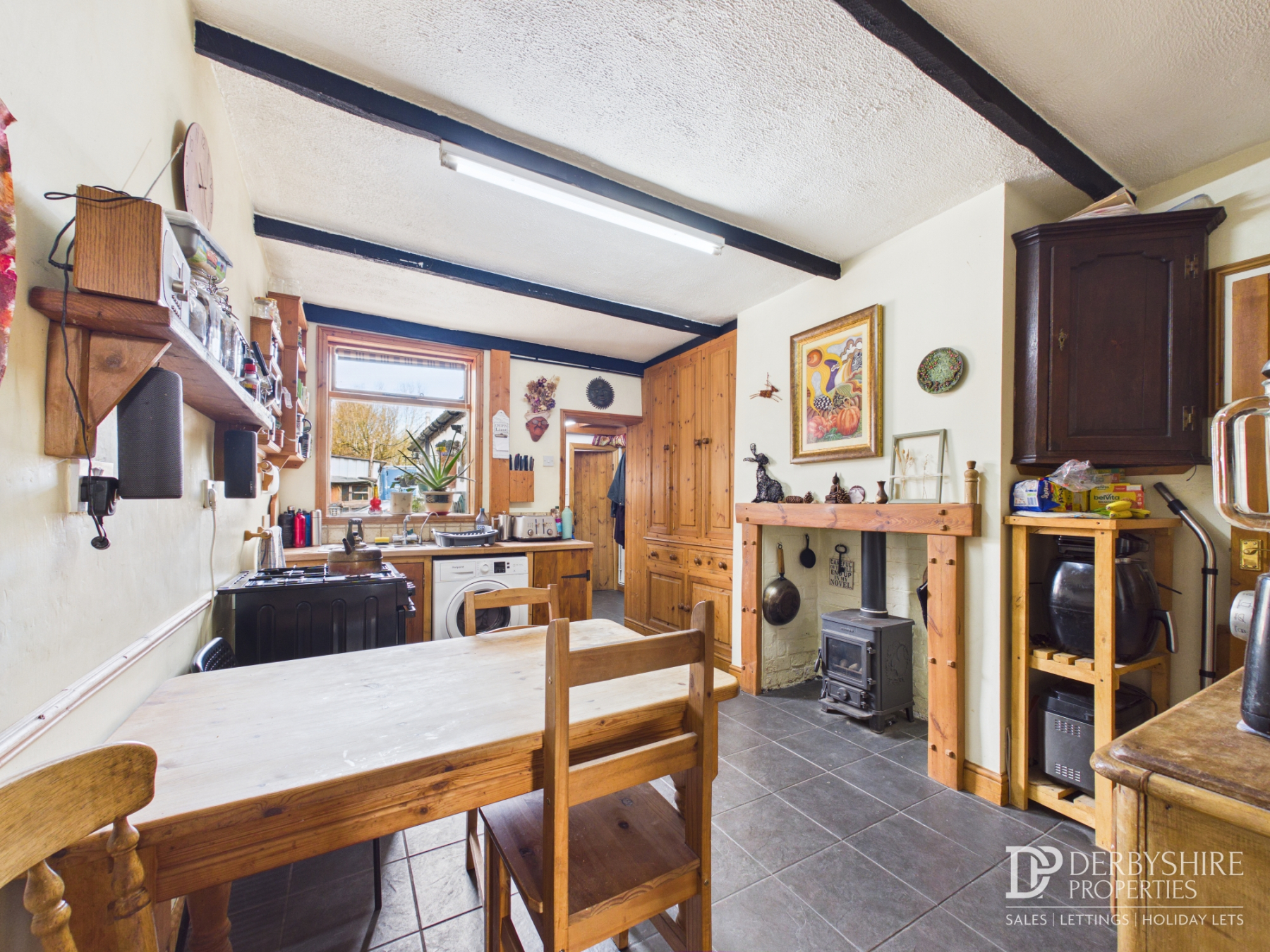 4.20m x 2.64m (13' 9" x 8' 8") Feature fireplace, with inset gas stove and wooden mantle. Fitted floor to ceiling unit with drawers. Sink unit with one and a half bowl sink with mixer tap. Plumbing for washing machine. Cooker point. Tiled floor. Window to the rear.