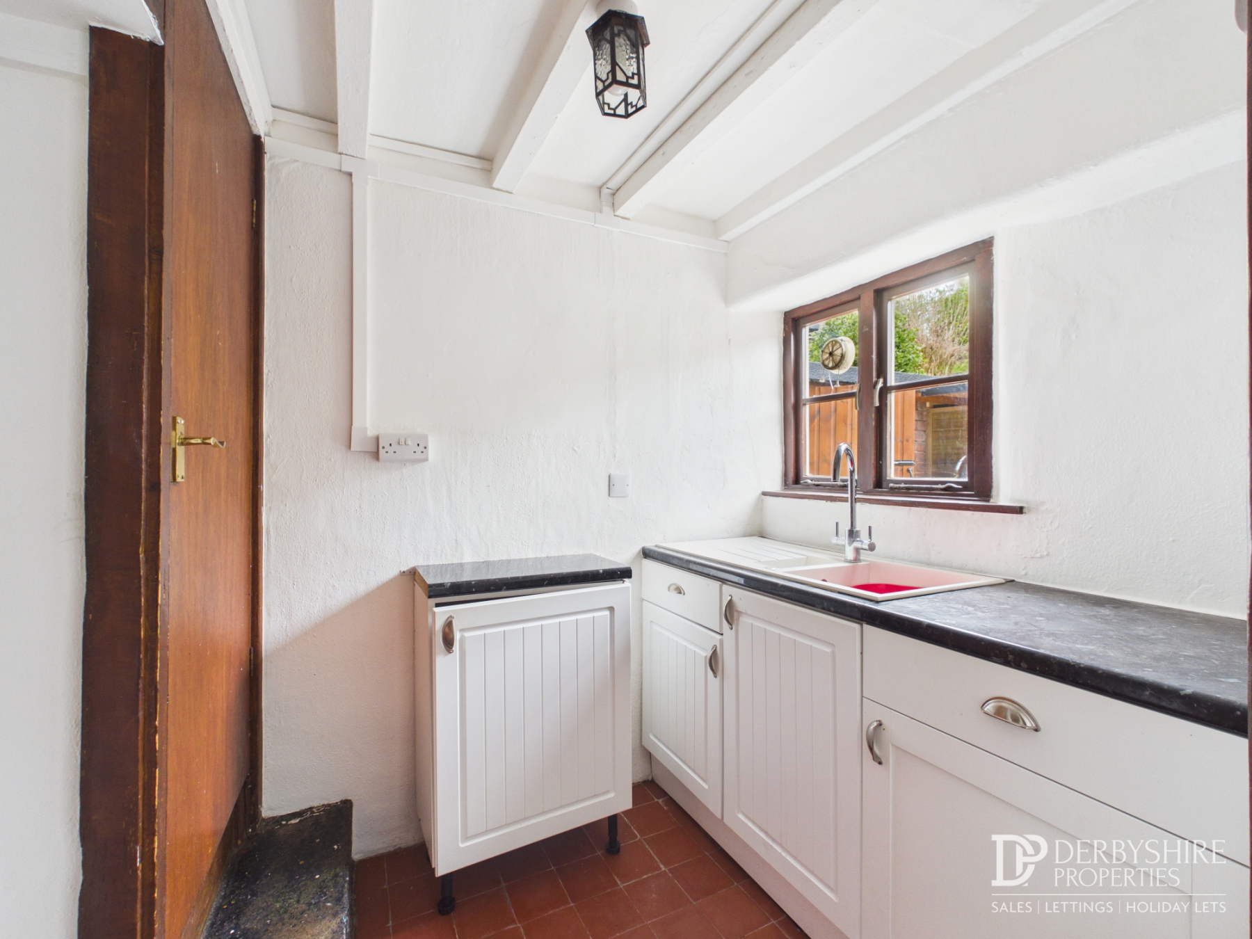 The kitchen is fitted with a range of base units with roll-top work surfaces incorporating a sink and drainer unit. There is quarry tiled flooring, a front-facing window, and access to both the lower ground floor via an original stone staircase, and the first-floor landing.