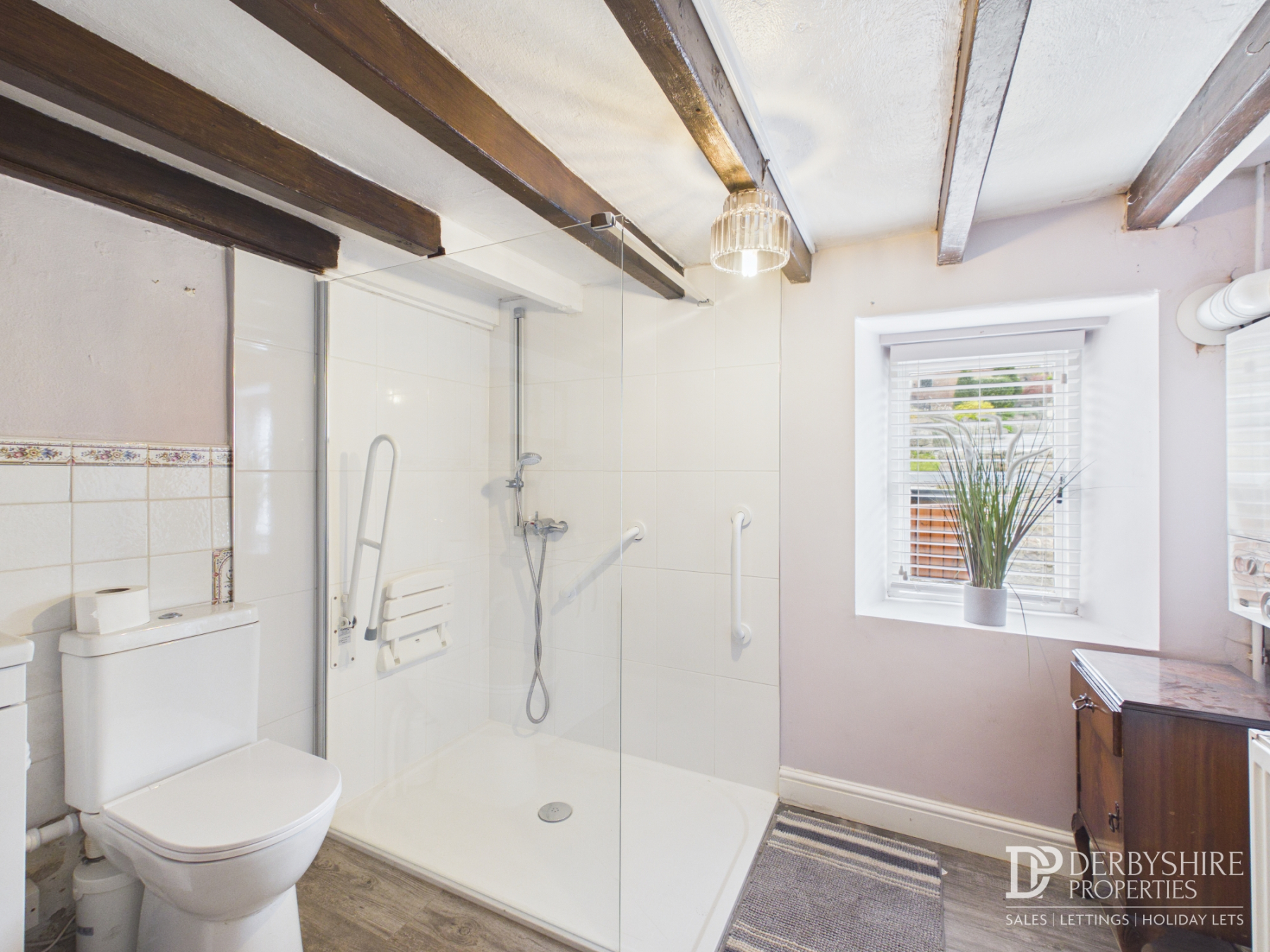 The bathroom (formerly a bedroom) is generously proportioned and fitted with a four-piece suite comprising WC, vanity wash hand basin, panelled bath, and large shower enclosure with mains-fed shower and attachment. The room also benefits from exposed ceiling beams, wood flooring, a window to the front elevation, wall-mounted gas combination boiler, radiator, and partial wall tiling.