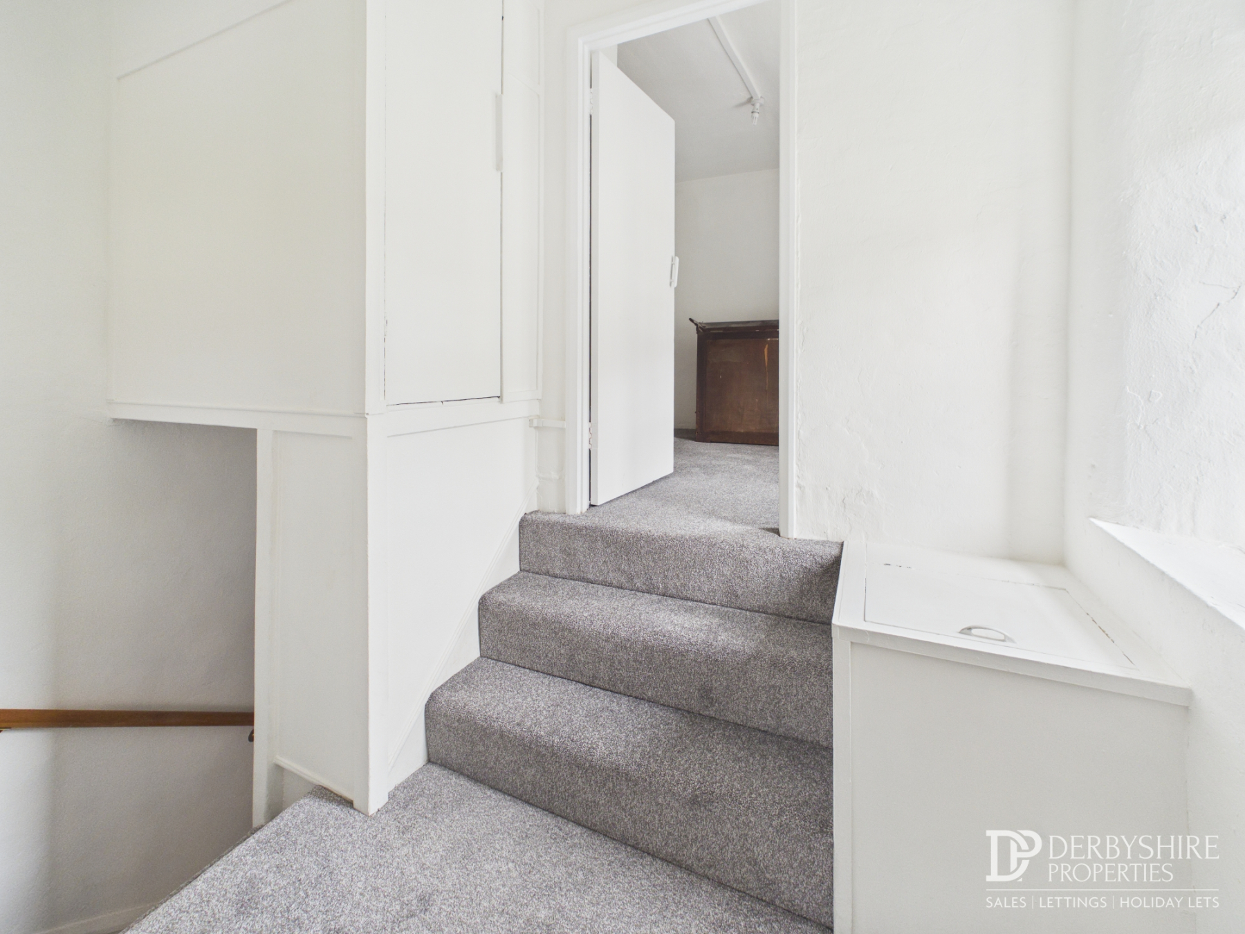 The landing has a window to the front elevation, an over-stairs storage cupboard, and access to the principal bedroom. Steps lead to a second bedroom.