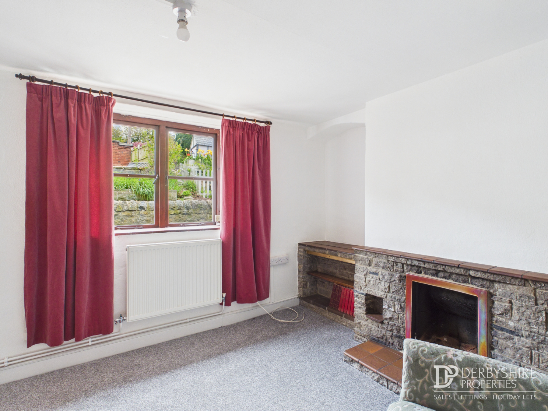 The living room features a window to the front elevation, wall-mounted radiator, and an attractive open fireplace with decorative stone surround and raised tiled hearth.