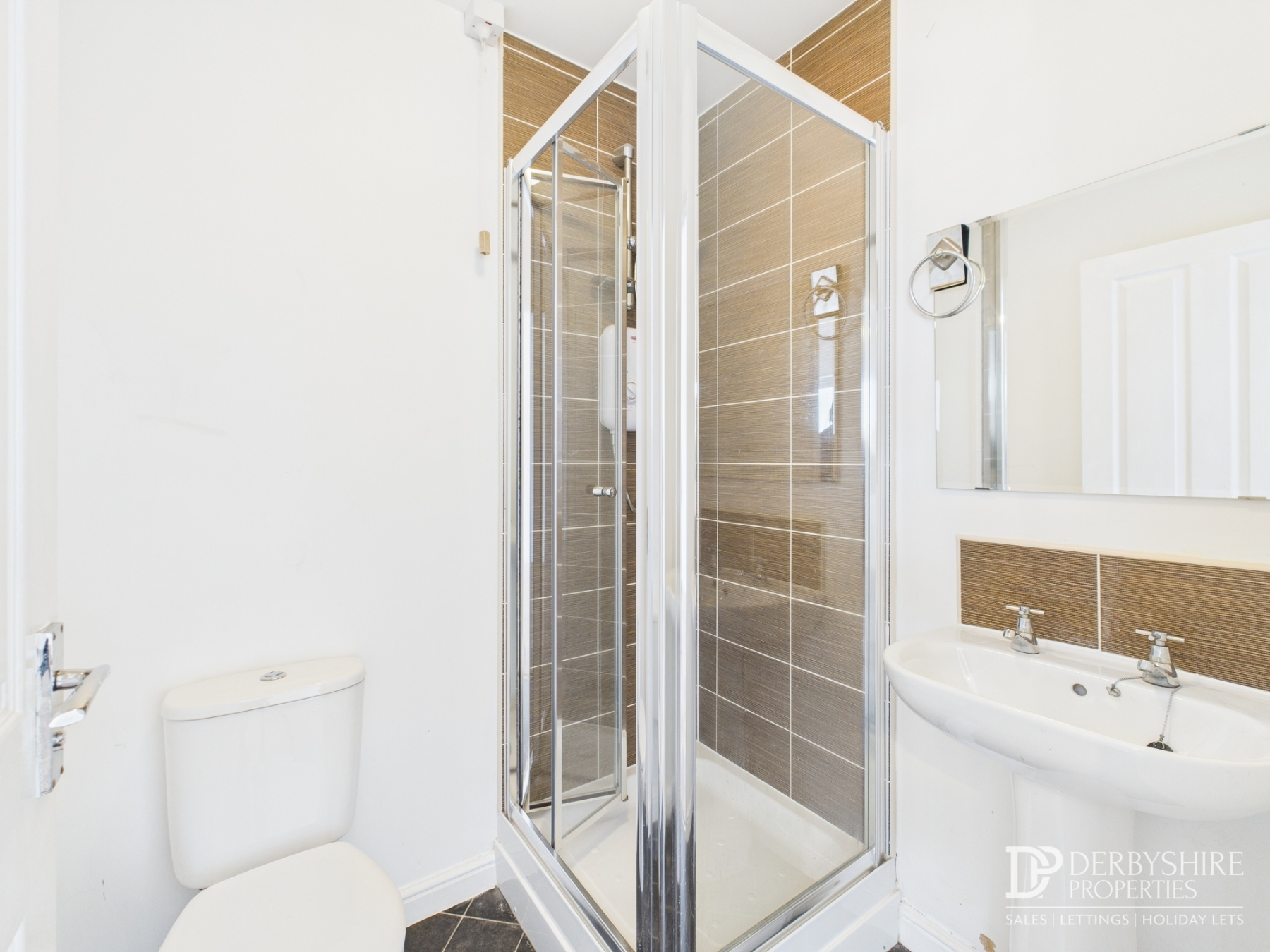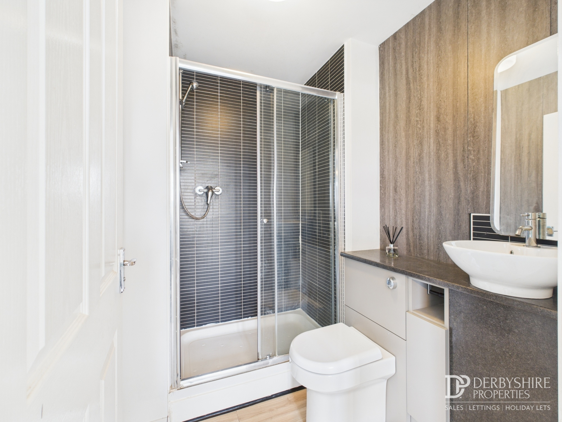 1.96m x 1.66m (6' 5" x 5' 5") A tiled three piece suite comprising; Double walk-in shower, vanity handwash basin and low level WC. Wall mounted mirror, mini wall mounted radiator and ceiling fitted extractor unit complete the space.