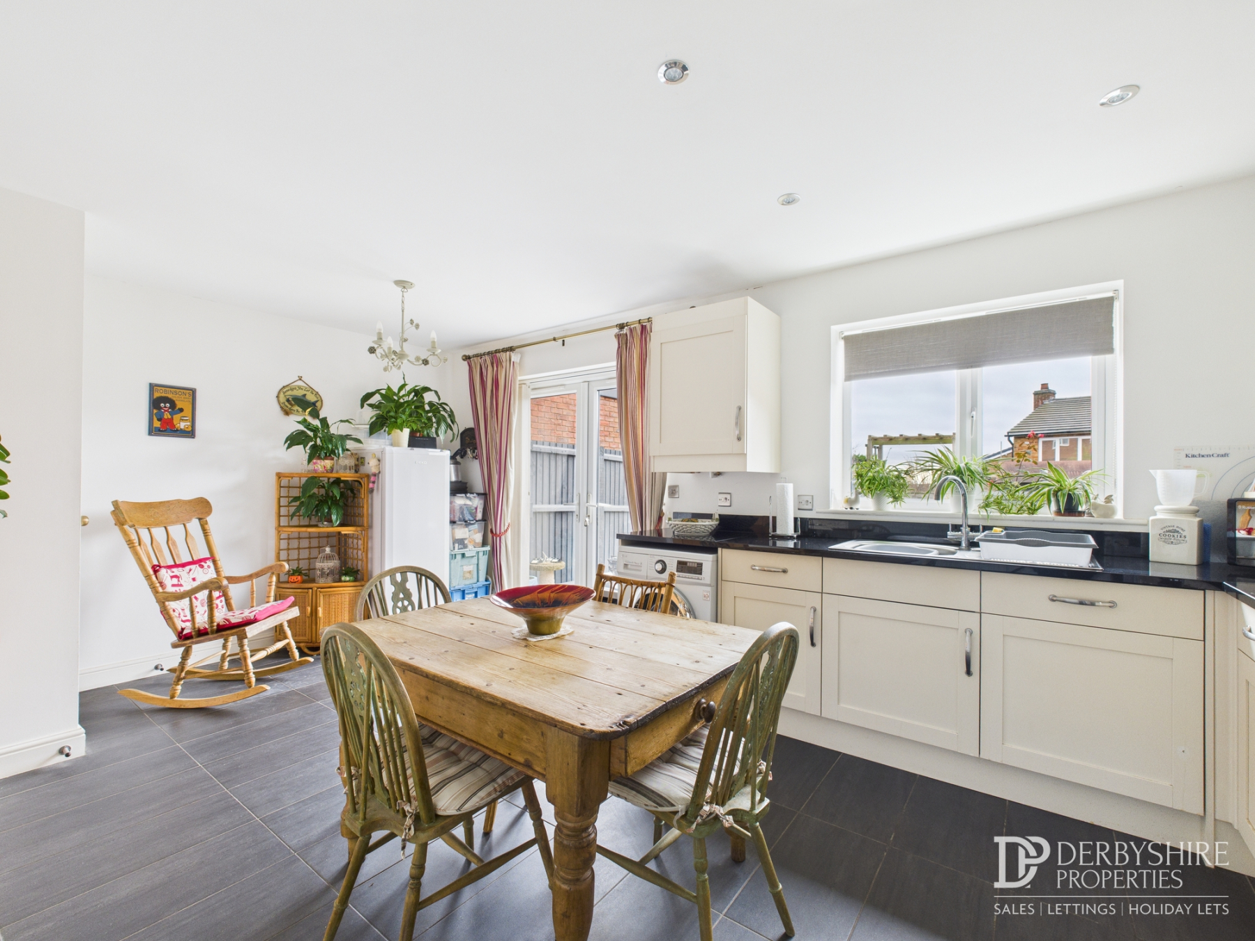 A spacious open-plan family environment, fitted with a range of matching wall and base units and granite worktops incorporating a stainless-steel sink with mixer tap and granite splashbacks. Appliances include integrated electric oven and four-ring gas hob with stainless steel extractor canopy above. Undercounter space/plumbing for a washing machine, space for fridge/freezer, tiled flooring, wall-mounted radiator and double-glazed French doors leading to the rear garden.
