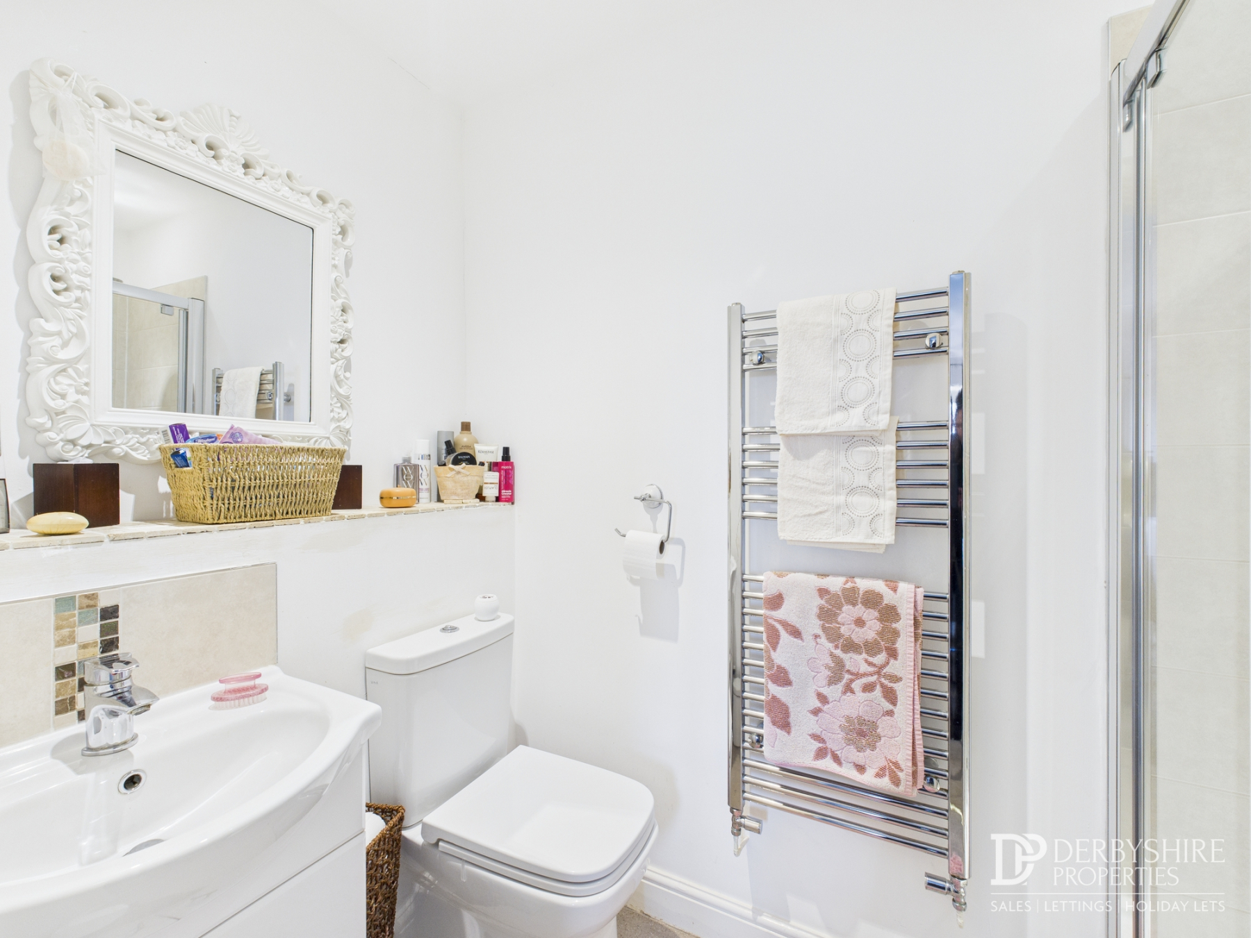 Comprising a three-piece suite: WC, vanity wash hand basin and shower enclosure with mains-fed shower and folding screen. Part tiled walls, chrome heated towel rail and ceiling extractor fan.