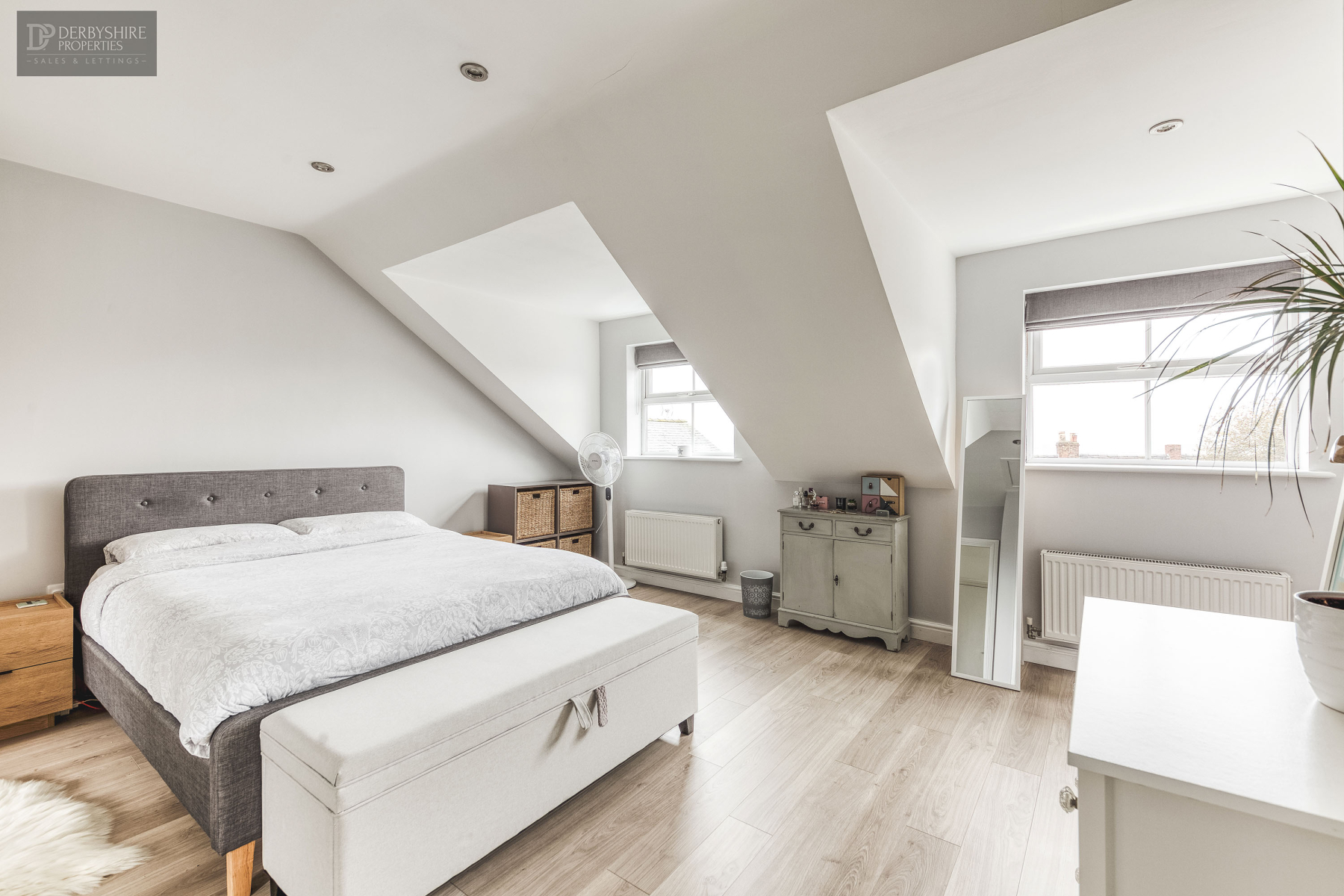 7.42m x 2.19m (24' 4" x 7' 2") This stunning bedroom suite offers two double glazed windows to the front elevation providing beautiful elevated views across Belper. Wall mounted radiators, wood floor covering, dressing area and a range of superb bespoke wardrobes providing ample storage in hanging space with additional window and radiator to the rear elevation.